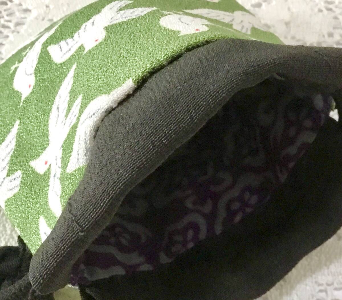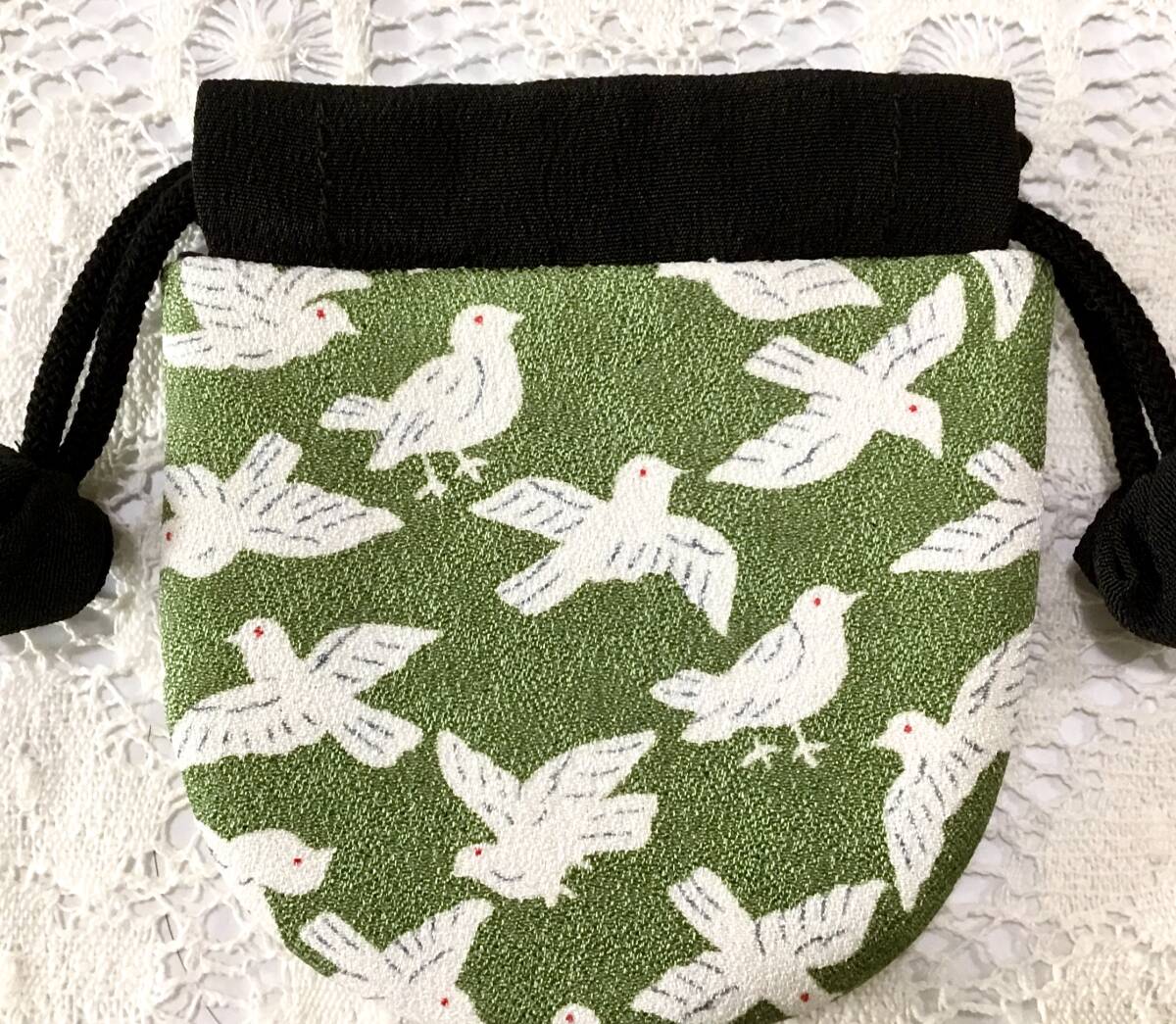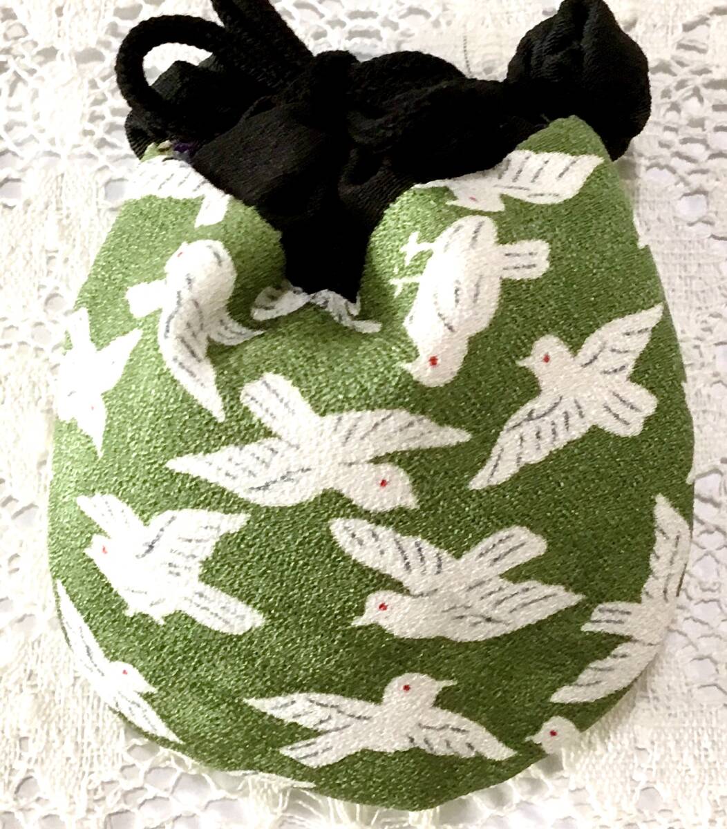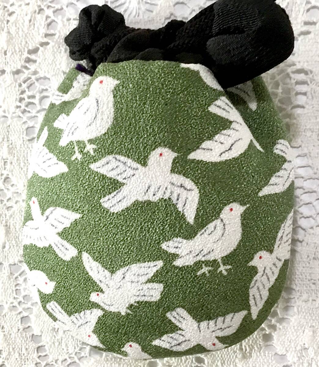 ■時代物の正絹着物地(落ち着いた緑地に小さな白鳩尽くし柄です。・・・錦紗)で作った、とっても可愛いキルト小袋です。