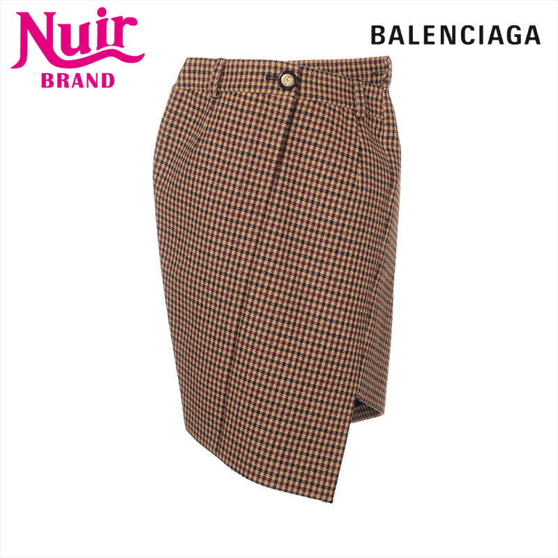 極美品 BALENCIAGA Size:34 チェック タイト 変形 シンメトリー ロゴボタン ウール 19年 スカート ベージュ