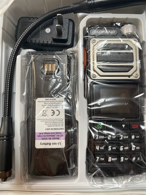 未使用、工場出荷状態、重くてメカニカルでちょっとレトロな最新Baofeng社ワイドバンド・トランシーバーです。