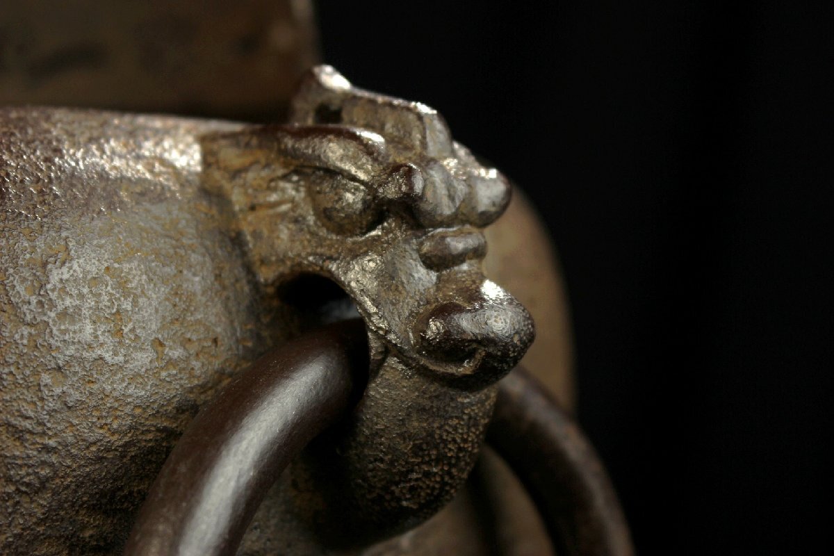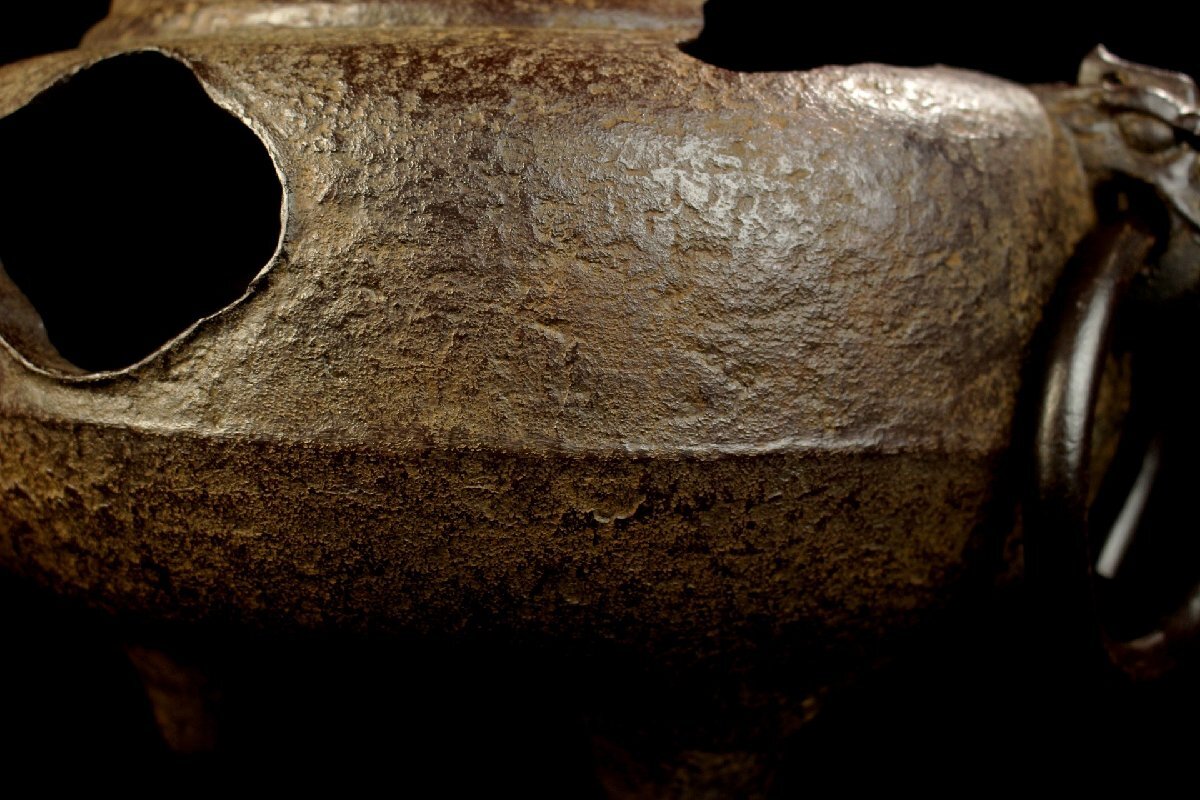 【董芸】十二代 加藤 忠三朗 (了三) 作 遊環獣耳 破れ鉄風炉 ヤツレ風炉 蔵出品 真作保証 [20897]