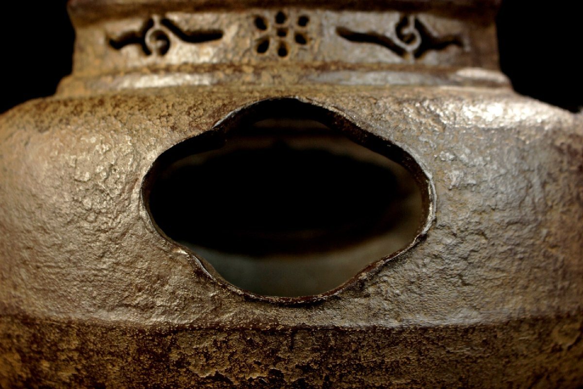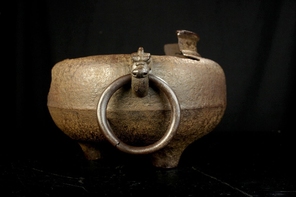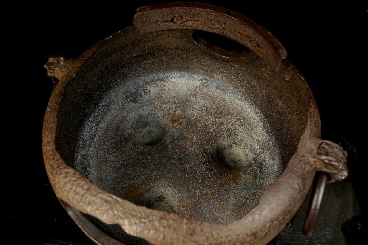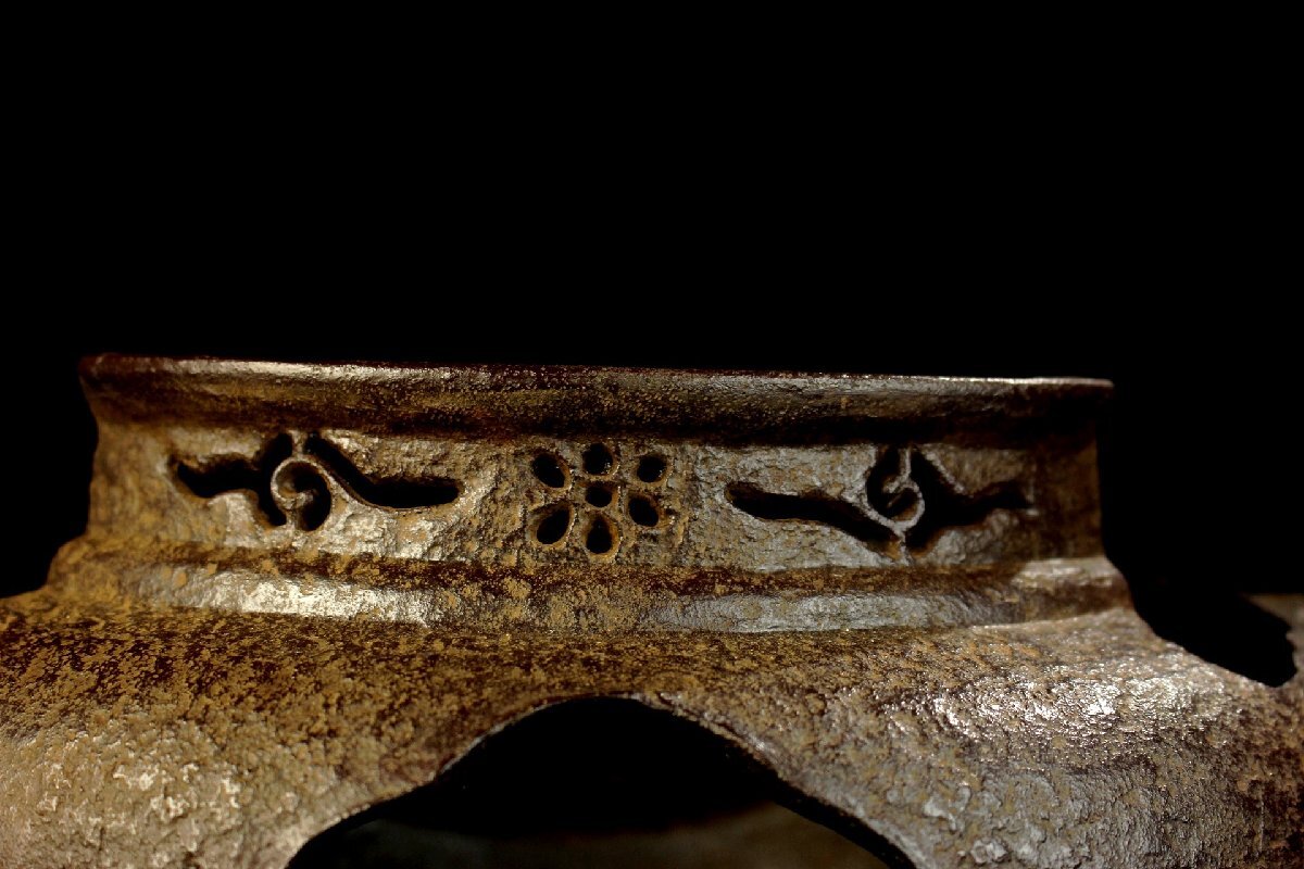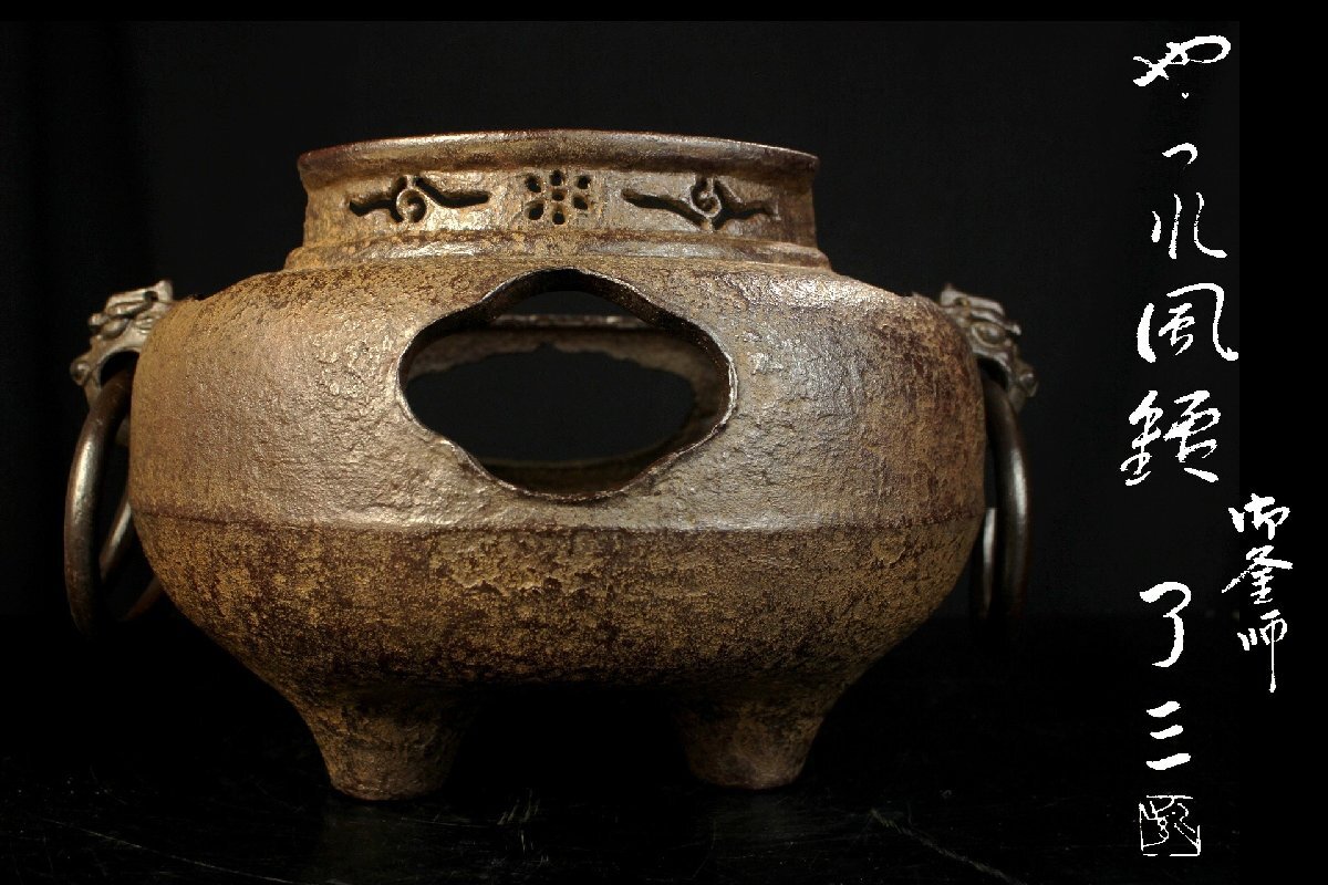 【董芸】十二代 加藤 忠三朗 (了三) 作 遊環獣耳 破れ鉄風炉 ヤツレ風炉 蔵出品 真作保証