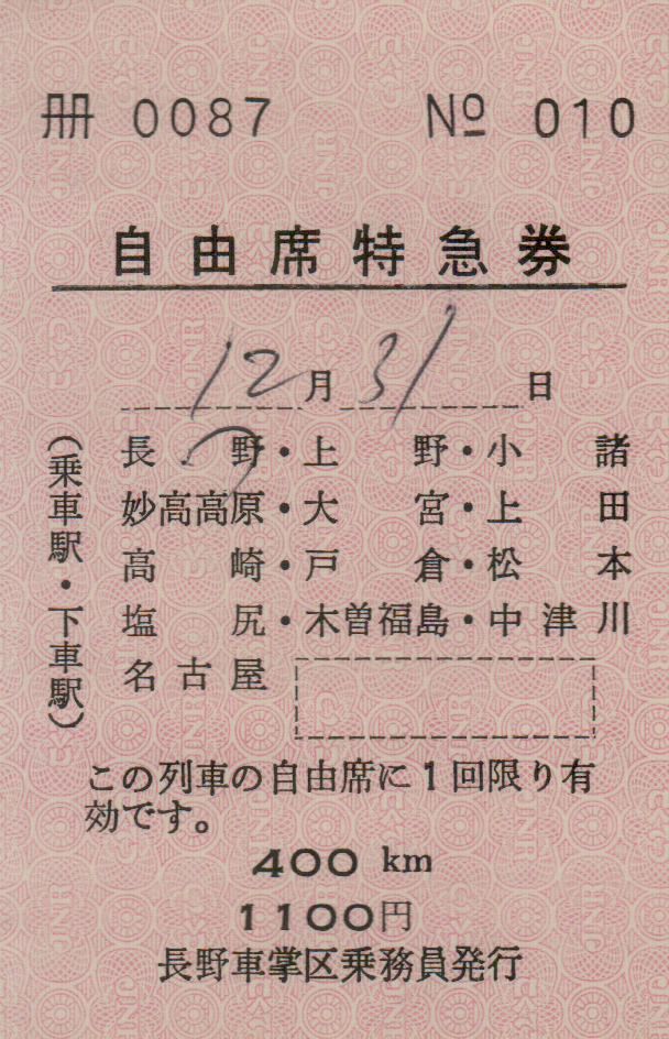 ▲▽▼ 国鉄 【 自由席 特急券 】 長野 400km まで