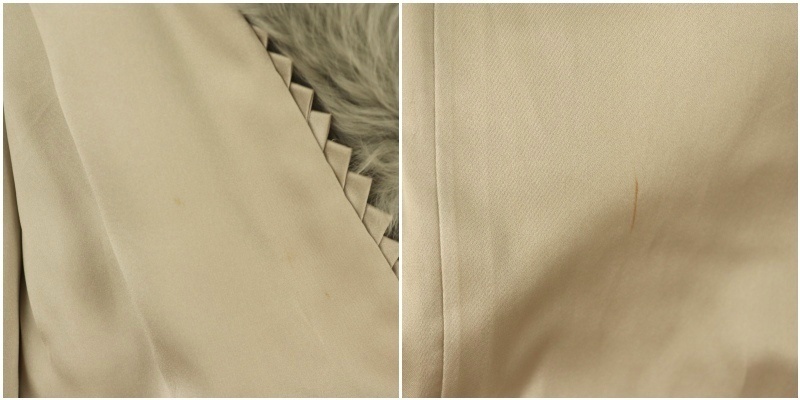 【状態】首周り裏地一帯とブランドタグなど裏地全体に茶色の薄汚れや濃淡茶色の汚れがあり、襟全体と両袖口周りに茶色の変色がございます。 ※全体的に中古品としての使用感と上記のようなダメージがありますが、通常使用には支障のない商品です。掲載写真や記載内容をご確認の上ご購入ください。