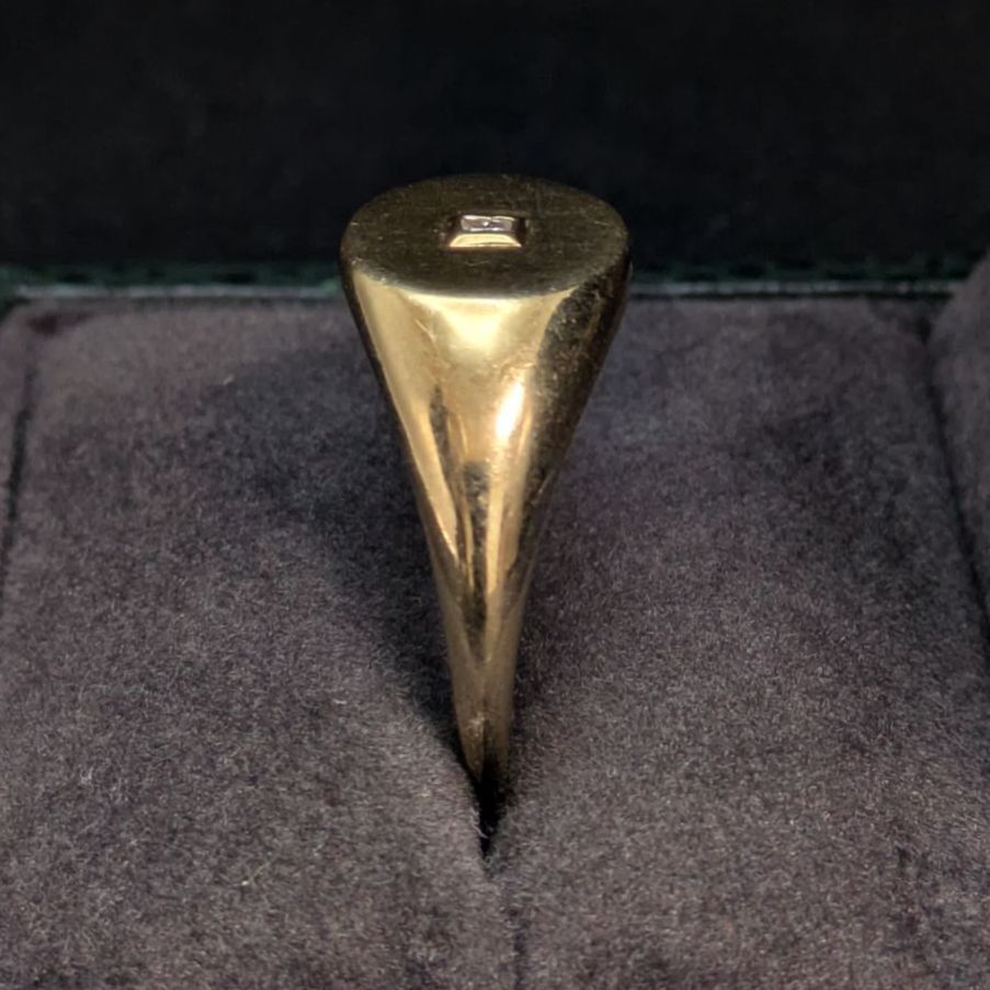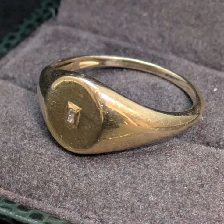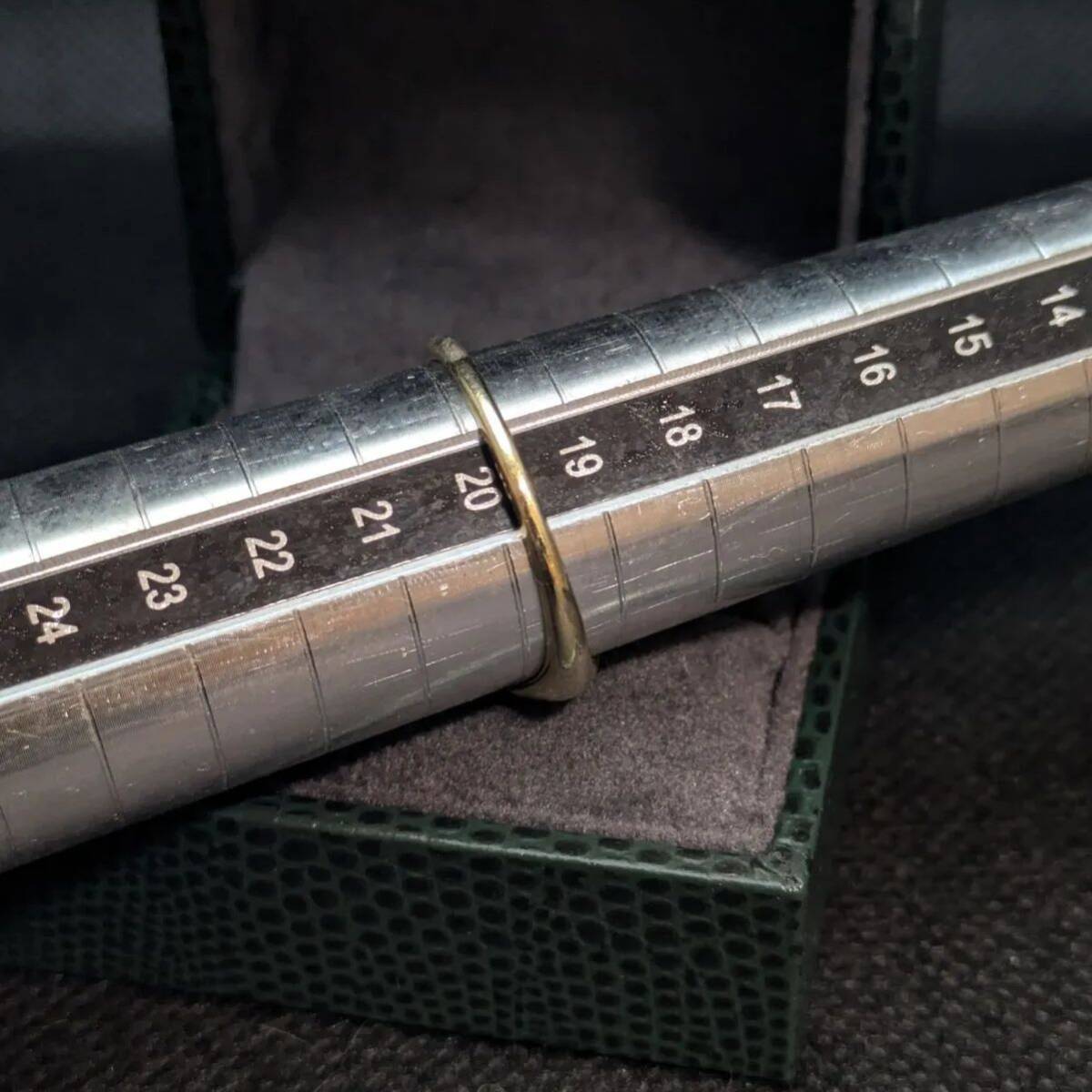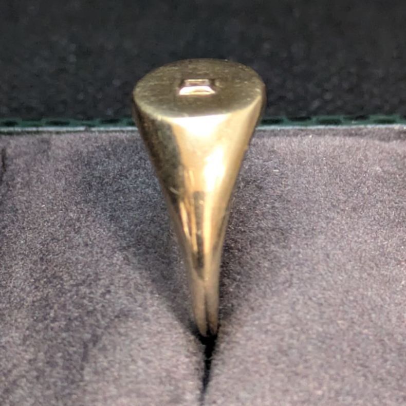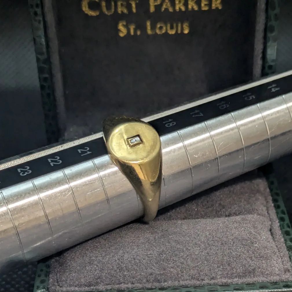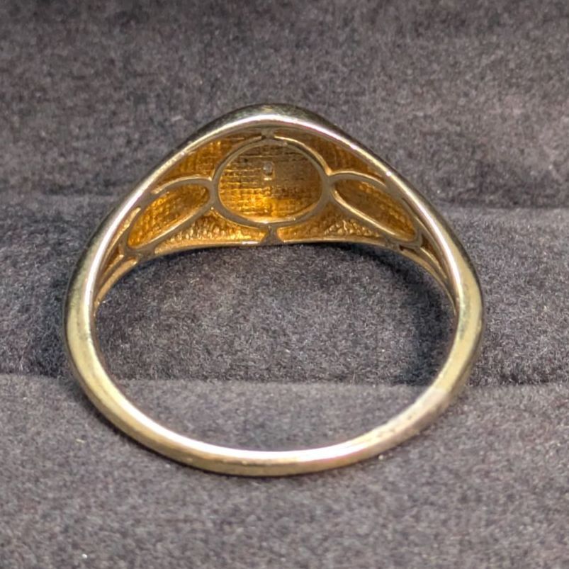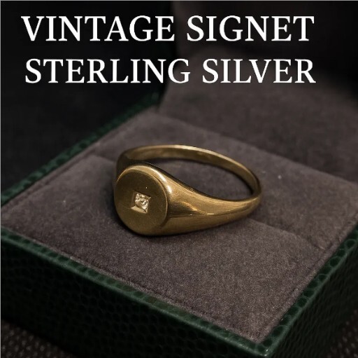 スターリングシルバーにゴールドメッキを施した上品なシグネットリング。中央には小さな石がセットされ、シンプルながら洗練されたデザインです。実際の石は不明ですが、控えめな輝きが落ち着いた印象を与えます。サイズは19.5〜20号で、男女問わずユニセックスにお使いいただけるバランス感のある一点物です。