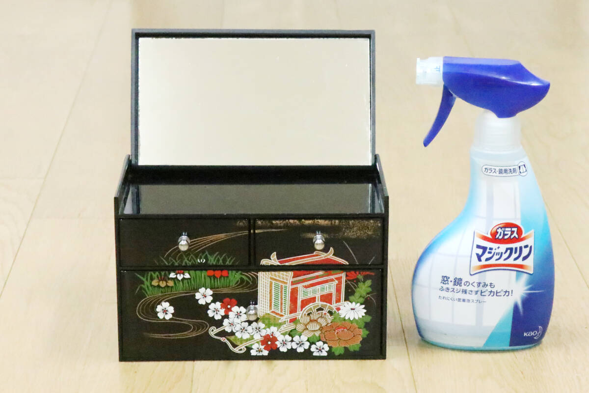 鏡付き小物入れになります。中古のため汚れ、傷があります。写真で判断お願いします。写っている物が全てになります(マジックリンは付属品ではありません)。大きさは横19㎝、奥行き12㎝、高さ12㎝です。