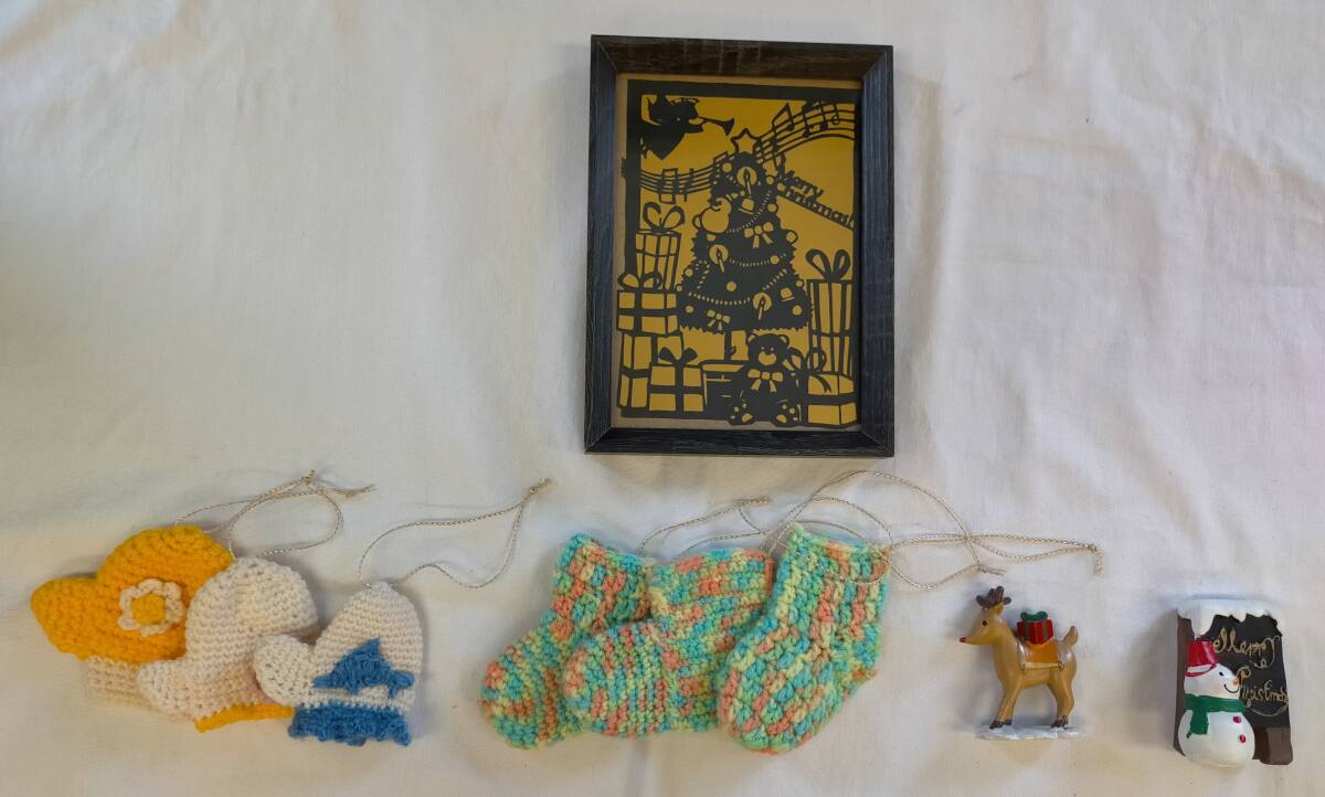 17 クリスマスオーナメント毛糸ミニ手袋/メーカー不明/①黄、白、花②黄、白、ピンクの花③白、青、イルカ