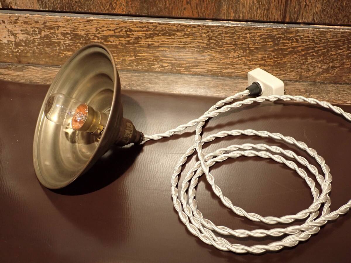 現地フランスで購入し、ずっと窓辺で使用していました。 本来は工房などでの作業時、手元を照らす為に作業台の上に、低く吊って使用するペンダントだそうです。 使用時に眩しくないよう、光の透過しない金属製(真鍮製)のシェードになっています。 このソケットにはスイッチ機能がありますので、手元でONと OFFとを切り替えられます。 ※ソケットに付いている固定リングを緩めて外すと、このシェード自体も簡単に取り外しができます。 入手時より、作業に合わせて吊る場所を変えられるように、かなり長めなケーブルが配線されていました。 ただ、そのケーブルは劣化がかなり酷かった為、出品に先立ち、ほぼ同じ長さの国内製の新しいケーブルに交換しました。 その際、元々付いていたフランス式コンセントプラグを外し、国内の引っ掛けシーリングに付け替えました。 ヨーロッパ仕様のフランス製ソケットとなりますので、対応電球もヨーロッパ球のB22電球となります。 電球は、B22仕様の10ワット電球が1個付属致しますが、ネット等でも購入は可能です。 ただ、発熱等の問題を避ける為、25W程度のまでのワット数でご使用頂けると安心です。 引っ掛けシーリングを含む全長は、約205㎝ あります。 真鍮製シェードの大きさは、直径 約14cm、高さ4.5cm です。 ソケットやシェード部分の状態ですが、真鍮独特の変色や染み、またシール跡などがありますが、特筆すべき目立つダメージはありません。 ただ、何十年もの間、実際に使用されてきたペンダントですので、使用感としての擦れた傷などは各所に見られます。 それでも経年からすると、全体的にとても良い状態だと思います。 状態をご確認頂けるようなるべく多くの画像を掲載致しましたので、ご自身での状態確認も必ずお願い致します。 |