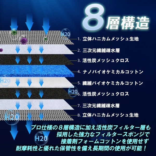 プロ仕様の8層構造に加え、活性炭フィルター層も採用した強力なフィルタースポンジで、接着剤フォームコットンを使用せず、耐摩耗性と優れた保管性を備え、長期間の使用が可能です。