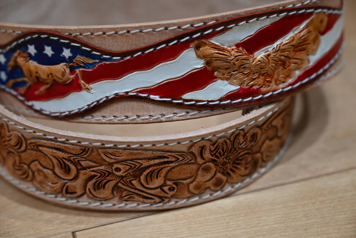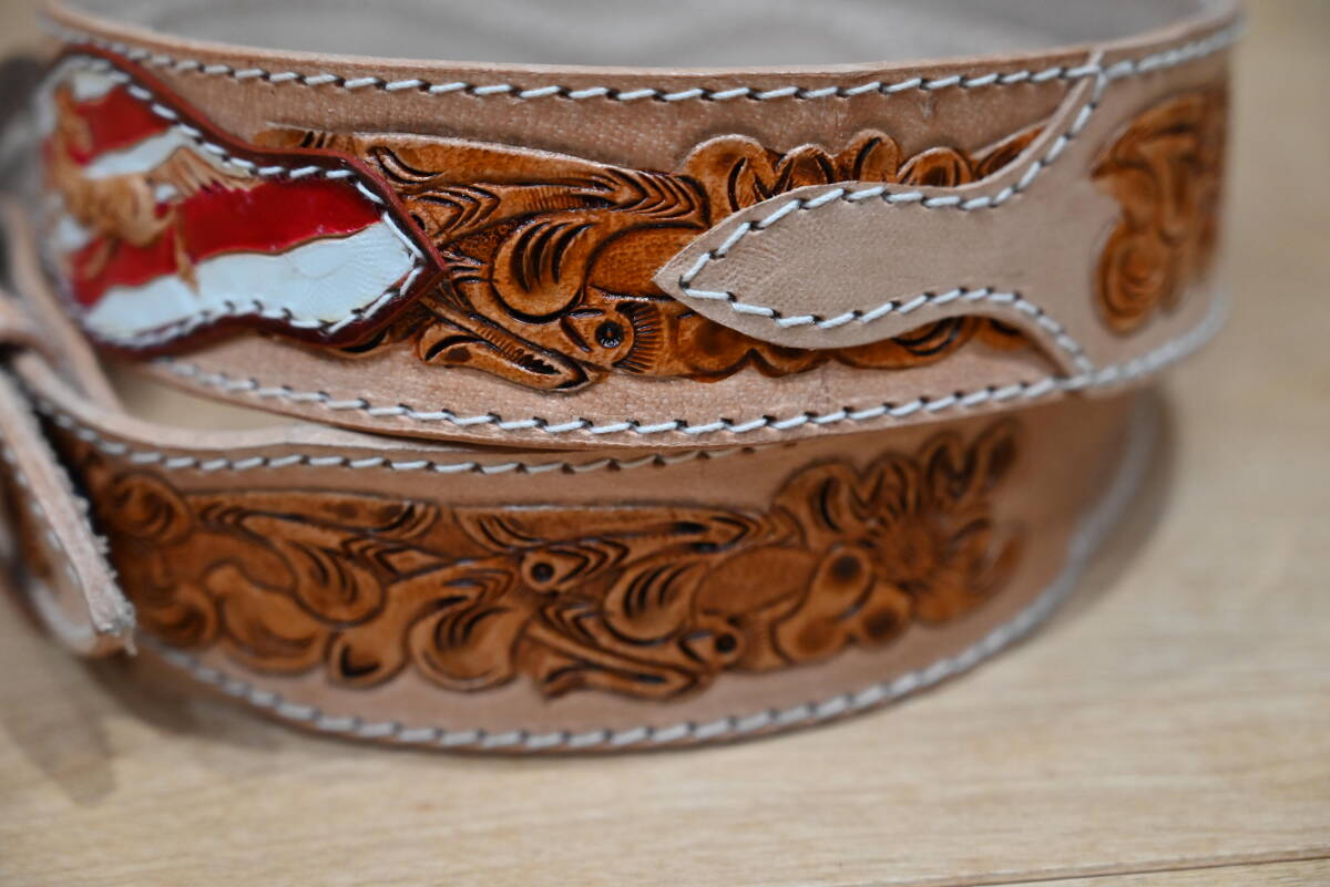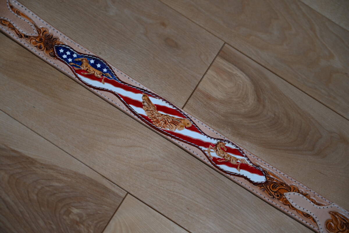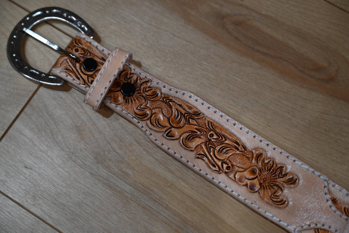 | 商品説明 | 牛革のカービング カントリー調ベルトです。3つのパーツを組み合わせて作成しています。 ナチュラルなヌメ革ベースなので、経年変化で色が飴色に変わっていく素材を使っています。色の変化を楽しんで頂ける品物です。 サイズは、ベルト本体は112㎝、ベルト幅は太い箇所は4.2㎝・細い箇所は3.7㎝、バックル部分の幅は3.5㎝、バックルは6㎝程になります。スナップボタンなので交換可能です。 左右のパーツは花柄にペイントして、中央パーツは星条旗、馬と鷲柄を立体的にデザインして、両淵はステッチ仕上げでカントリー調の品物になります。裏側は革質が出ているような仕上がりにしています。厚さは3㎜になります。 ベルトの穴開けは、調節出来るように、購入者の方にお願いします。4㎜コンチョがお勧めです。 バックルの部分はボタンタイプなので、簡単に交換できるようになってます。 発送は、定形外郵便を利用します。送料は、450円になります。 こちらは、ハンドメイドで、ヌメ革素材を使っていますので、多少の傷や汚れ等はご了承下さい。細かい点まで、気になる方はご遠慮下さい。 |