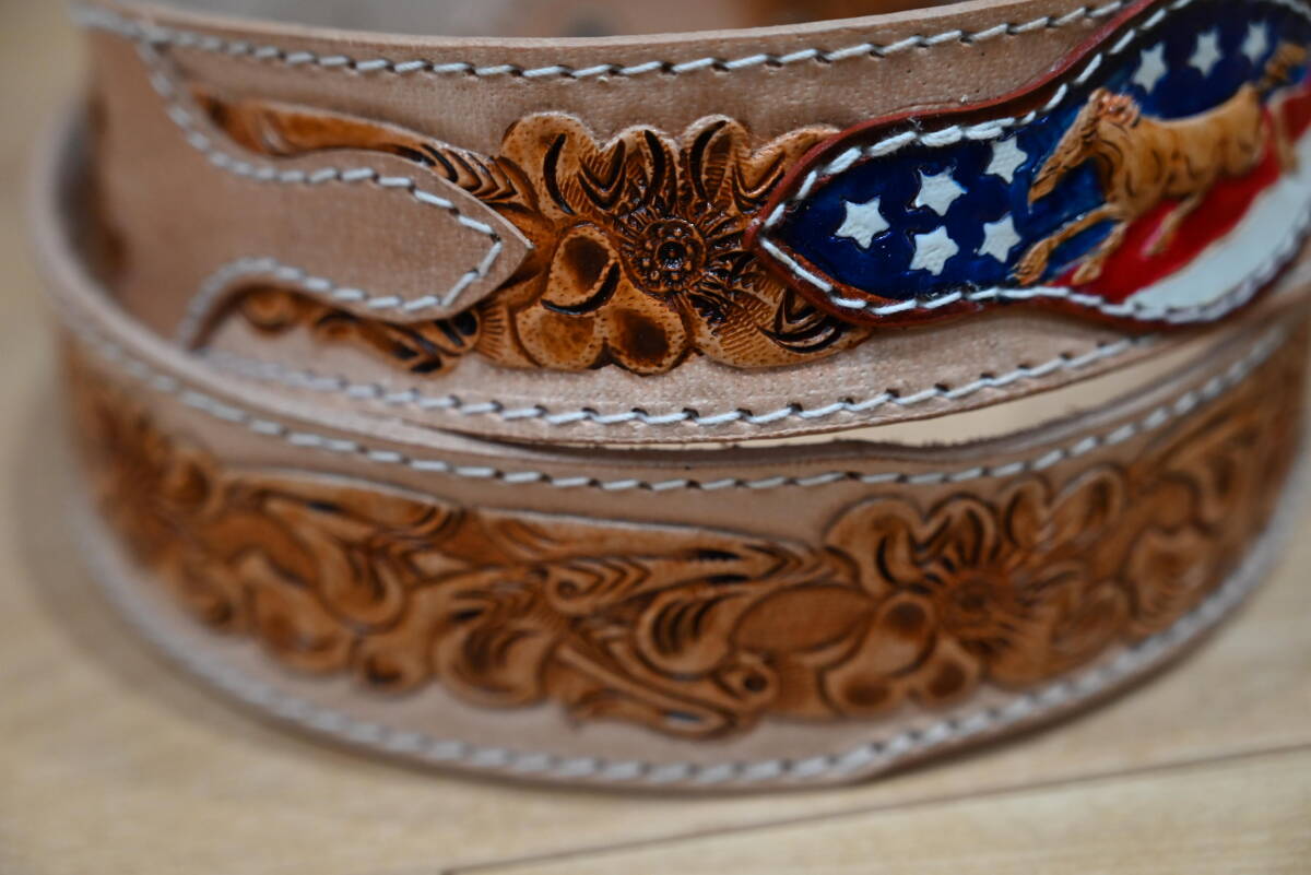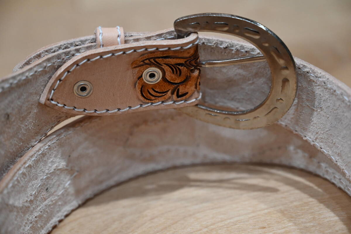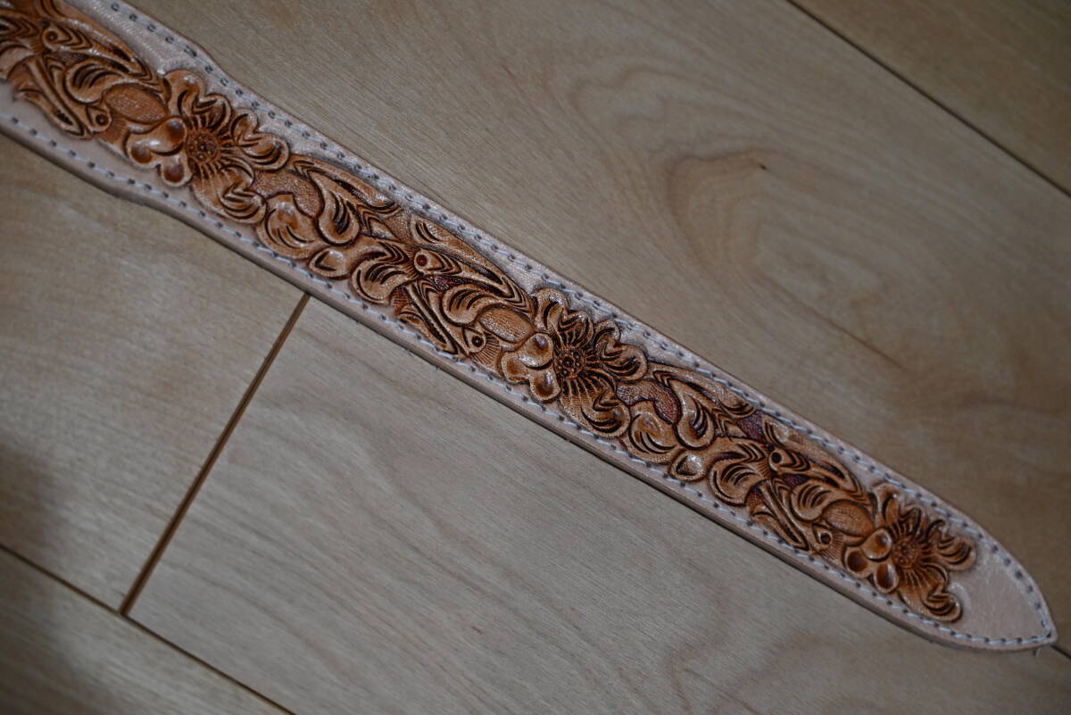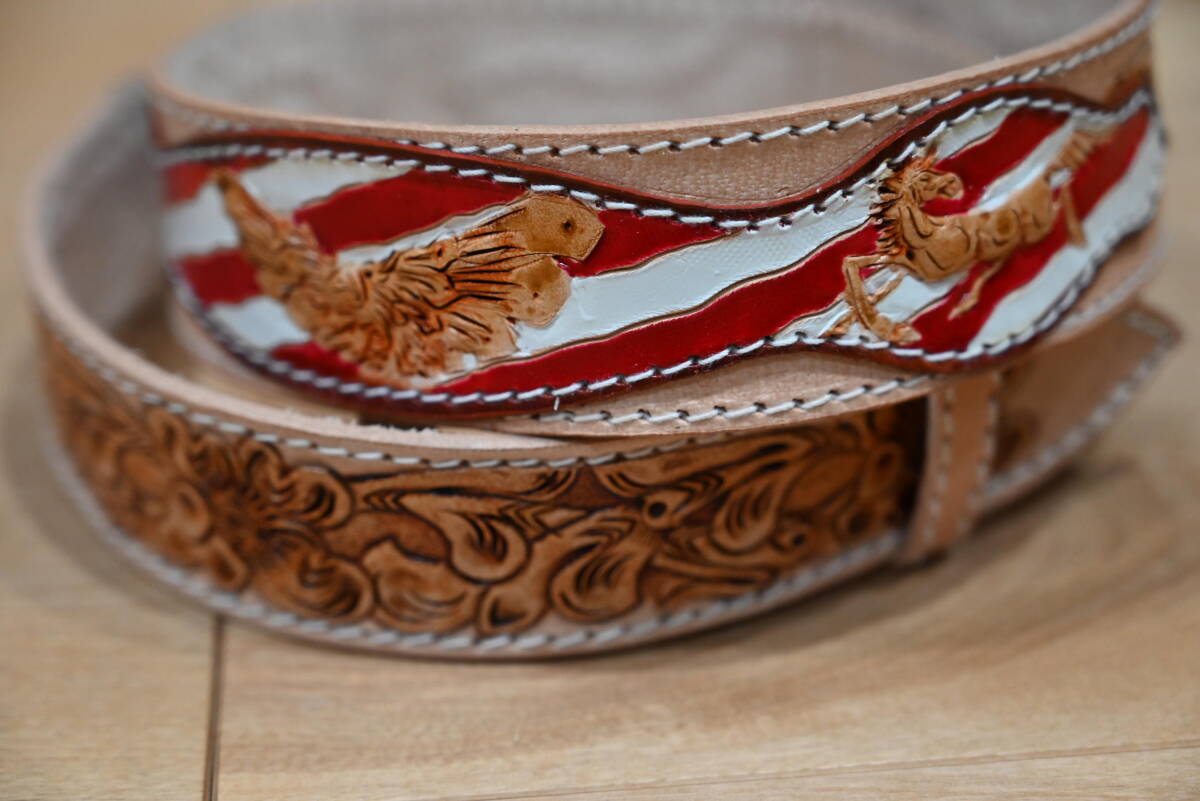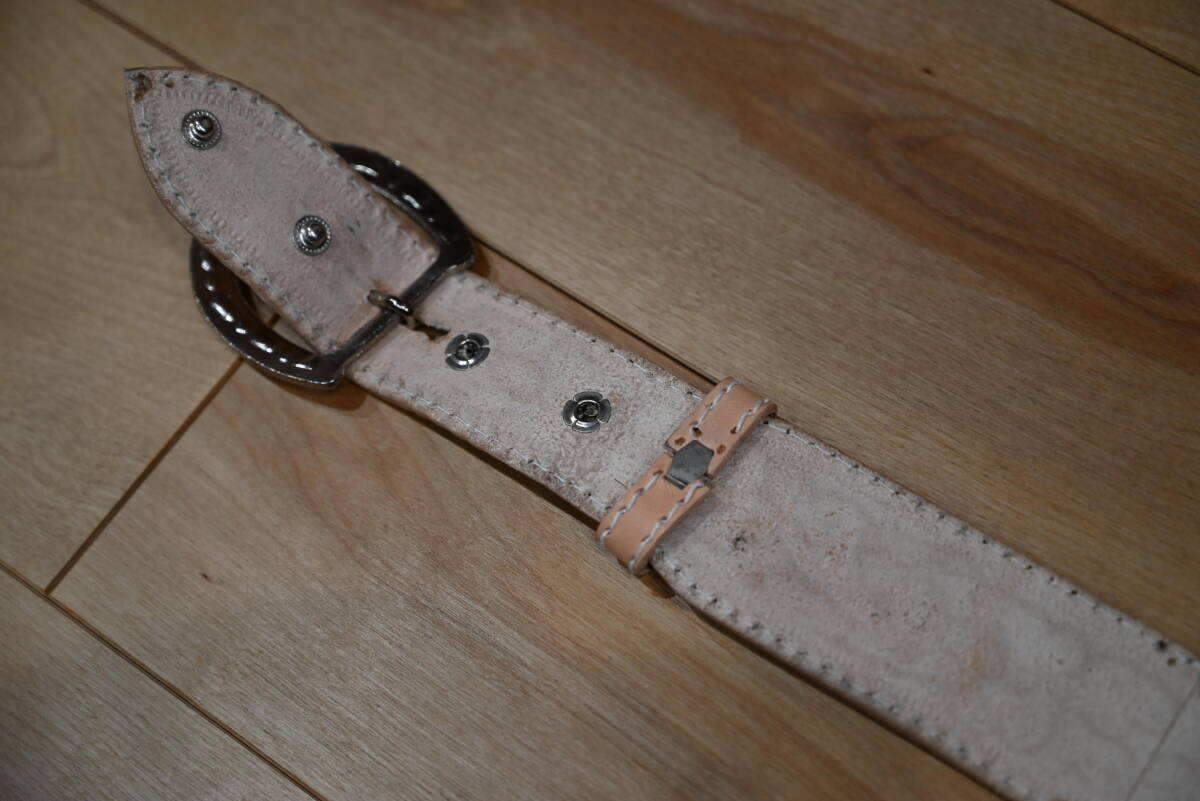 | 商品説明 | 牛革のカービング カントリー調ベルトです。3つのパーツを組み合わせて作成しています。 ナチュラルなヌメ革ベースなので、経年変化で色が飴色に変わっていく素材を使っています。色の変化を楽しんで頂ける品物です。 サイズは、ベルト本体は112㎝、ベルト幅は太い箇所は4.2㎝・細い箇所は3.7㎝、バックル部分の幅は3.5㎝、バックルは6㎝程になります。スナップボタンなので交換可能です。 左右のパーツは花柄にペイントして、中央パーツは星条旗、馬と鷲柄を立体的にデザインして、両淵はステッチ仕上げでカントリー調の品物になります。裏側は革質が出ているような仕上がりにしています。厚さは3㎜になります。 ベルトの穴開けは、調節出来るように、購入者の方にお願いします。4㎜コンチョがお勧めです。 バックルの部分はボタンタイプなので、簡単に交換できるようになってます。 発送は、定形外郵便を利用します。送料は、450円になります。 こちらは、ハンドメイドで、ヌメ革素材を使っていますので、多少の傷や汚れ等はご了承下さい。細かい点まで、気になる方はご遠慮下さい。 |