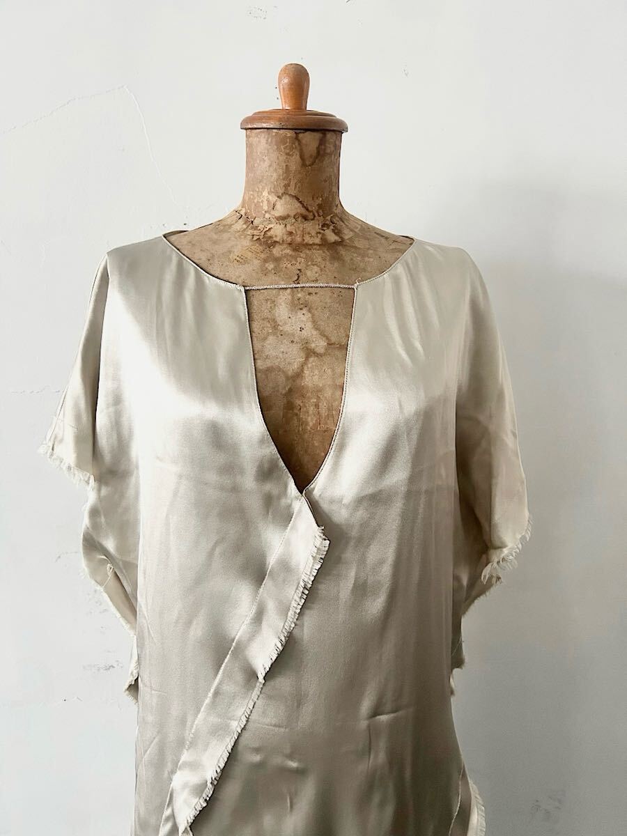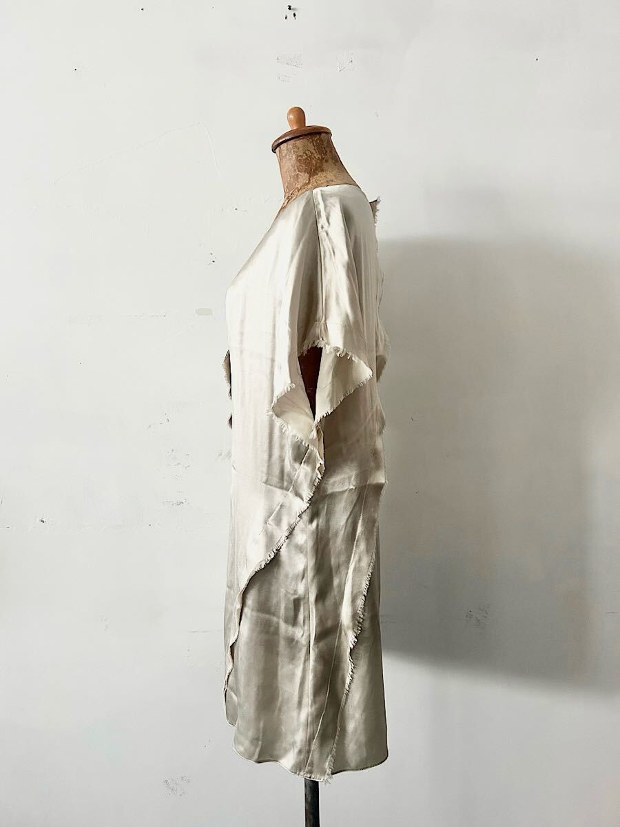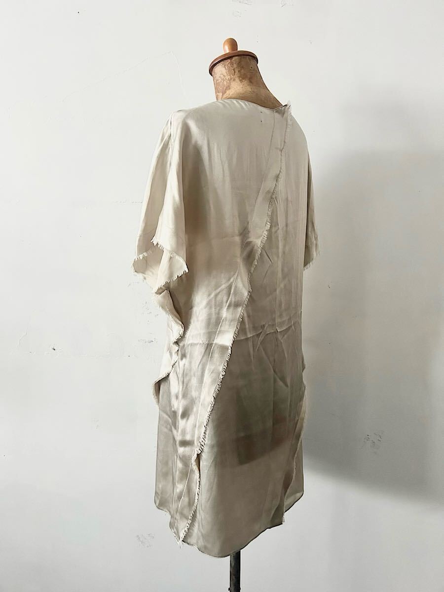 カラーは艶のあるシャンパンゴールドで上品なシルク素材のワンピースです。