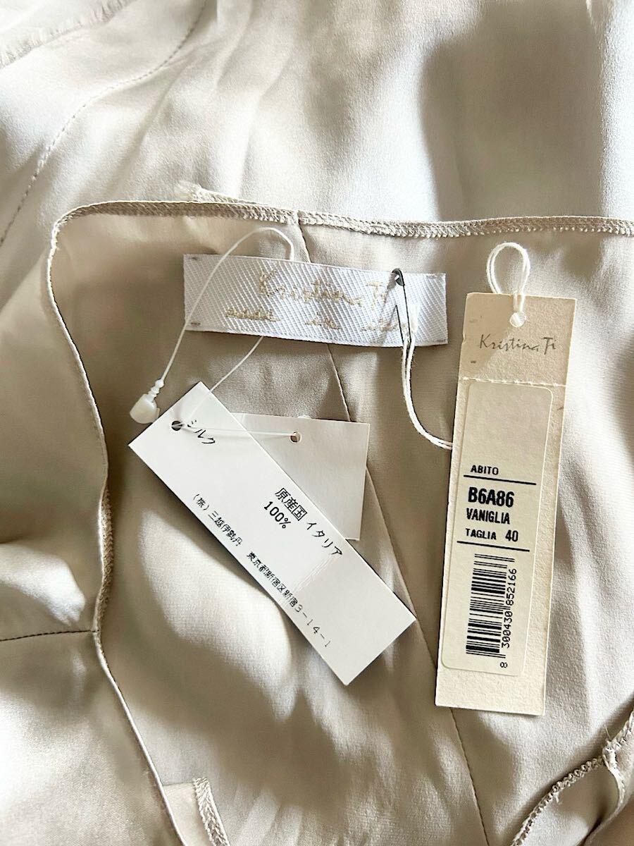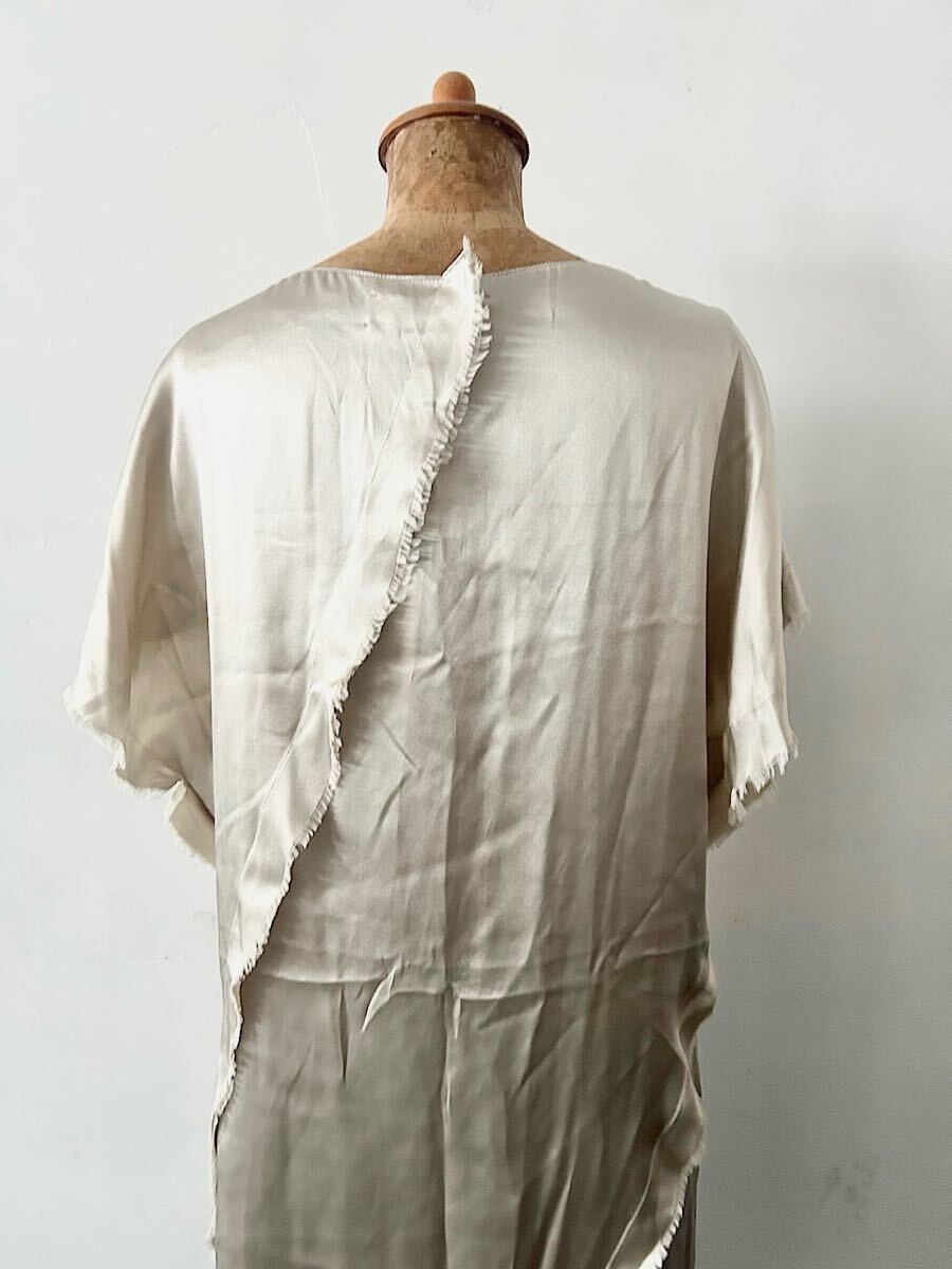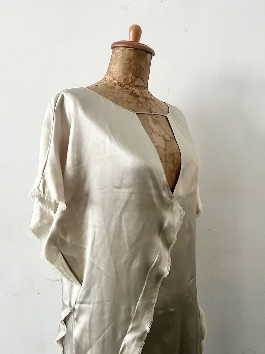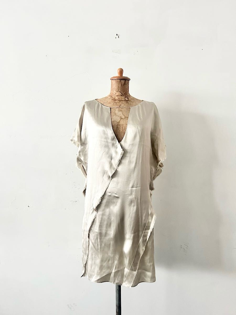 カラーは艶のあるシャンパンゴールドで上品なシルク素材のワンピースです。