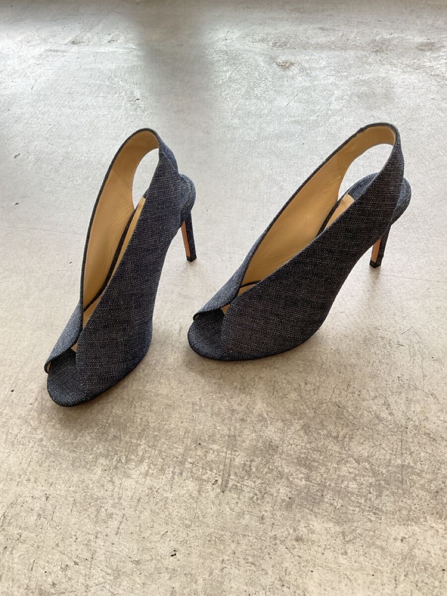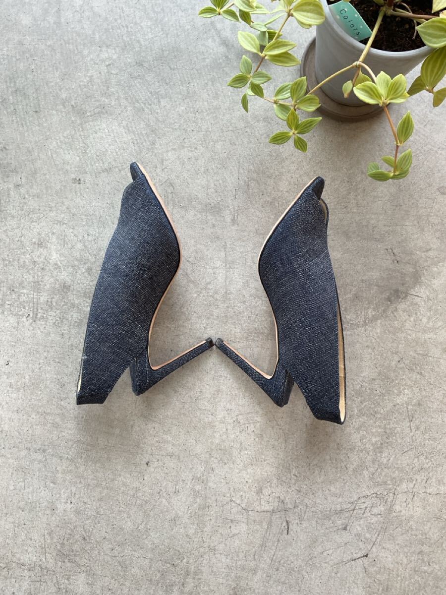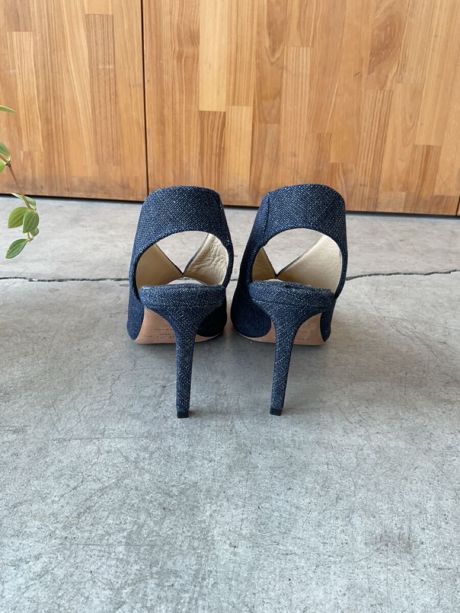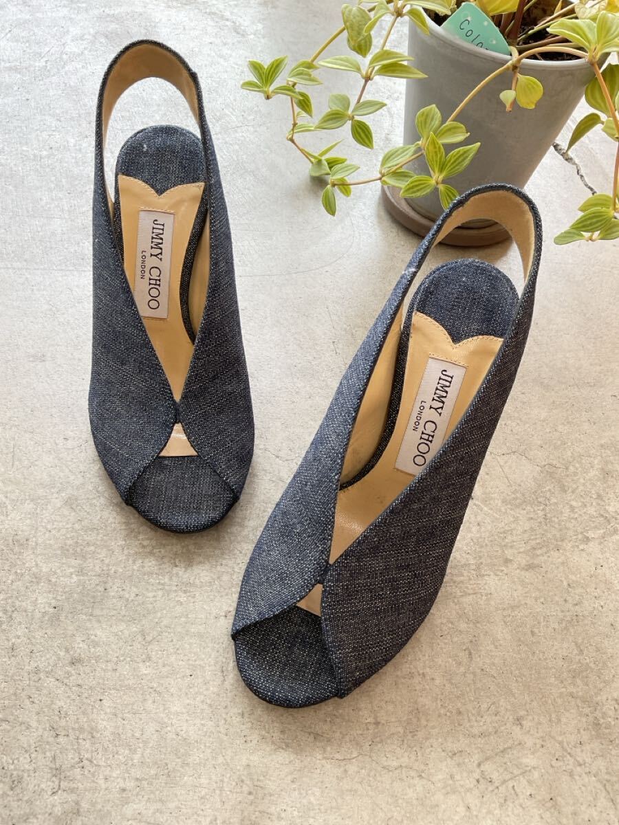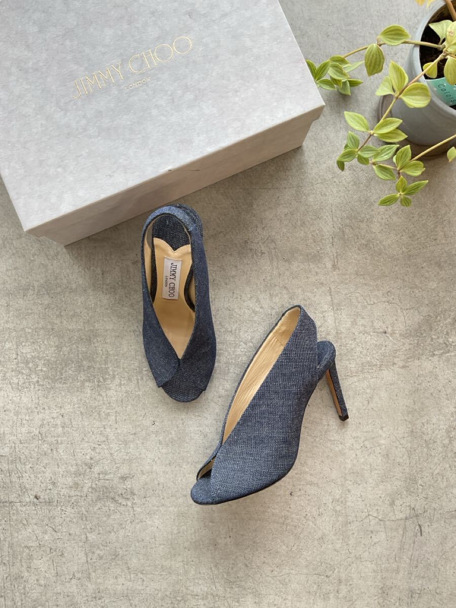 美品 JIMMY CHOO ジミーチュウ インディゴストラップパネルヒールパンプス オープントゥピンヒールデニムシューズ ネイビー紺色系 36 q
