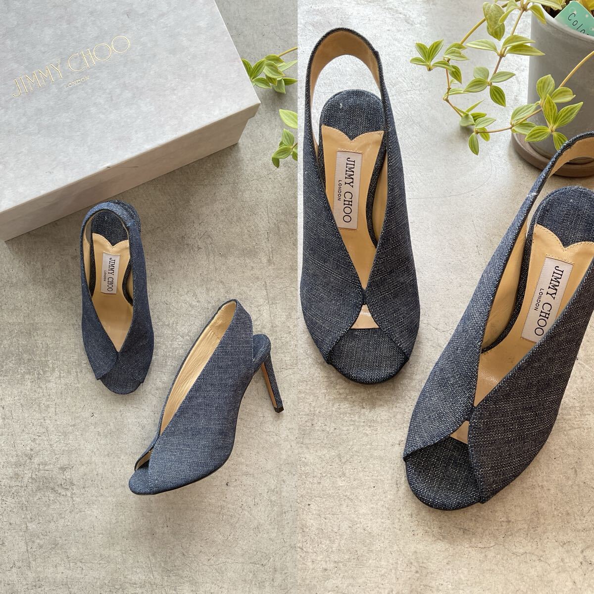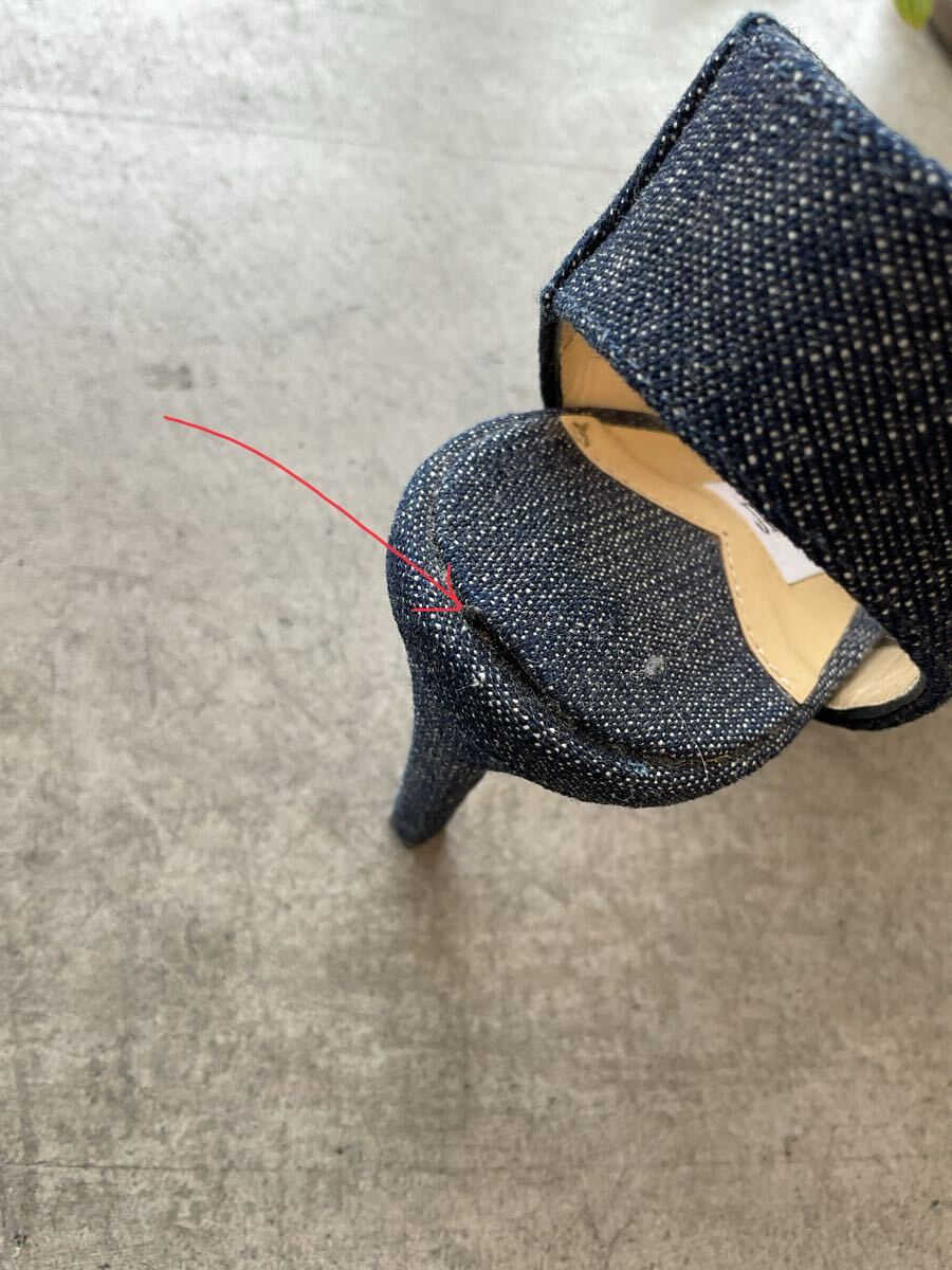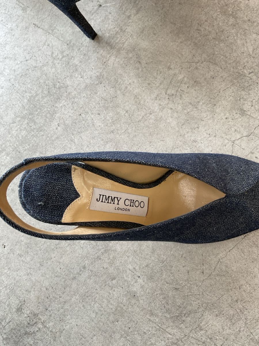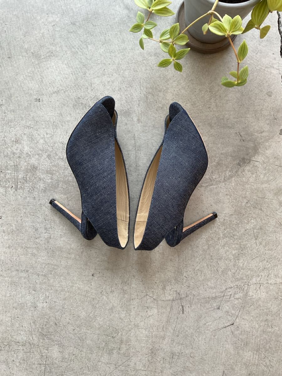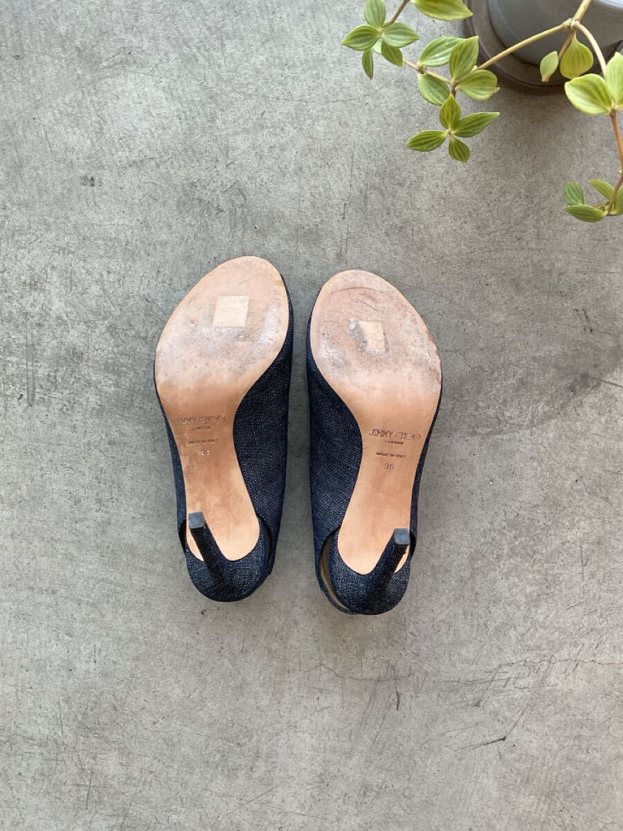 美品 JIMMY CHOO ジミーチュウ インディゴストラップパネルヒールパンプス オープントゥピンヒールデニムシューズ ネイビー紺色系 36 q