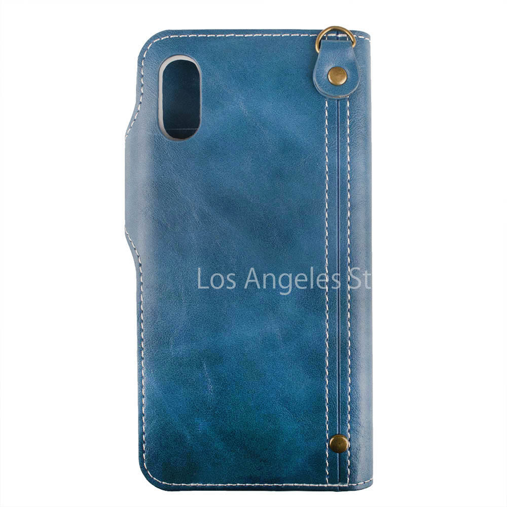 iPhoneXS iPhone XS ケース ストラップ レザー カバー 革 手帳型 青 ブルー ボタン式