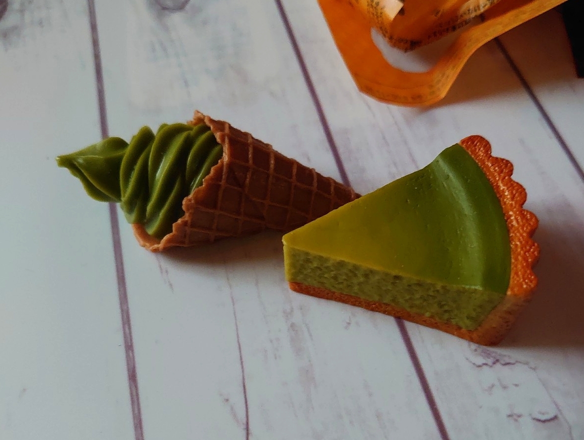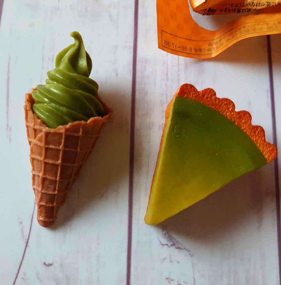 ソフトクリームは7×3×2くらい、タルトは5×3.5×2cmくらいです。取り出して見たあとパッケージに戻して保管していましたが、どちらも経年により粘着が弱ったようで開封状態でした。