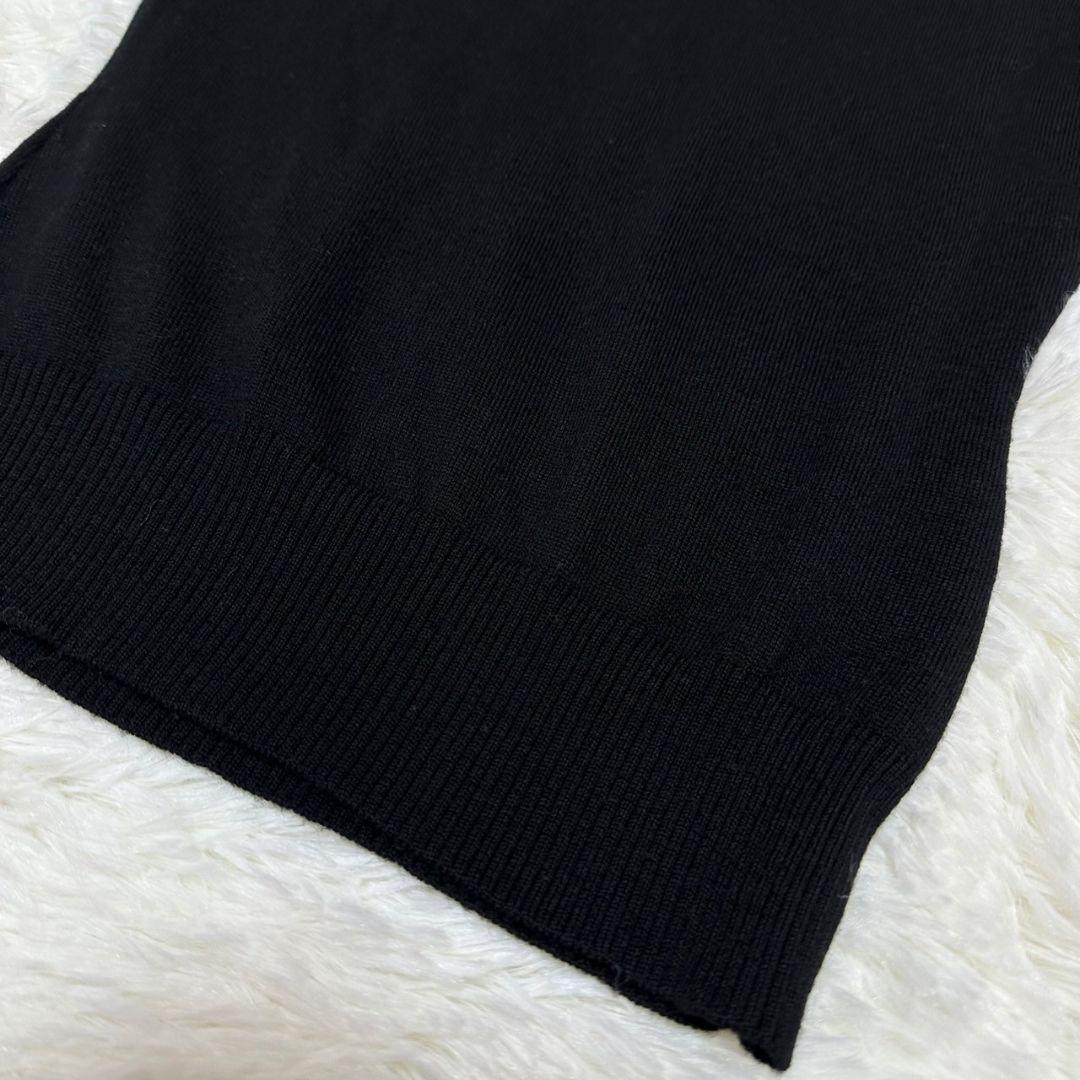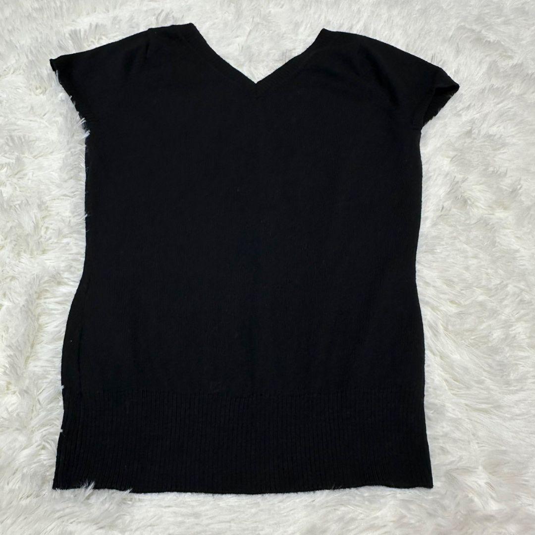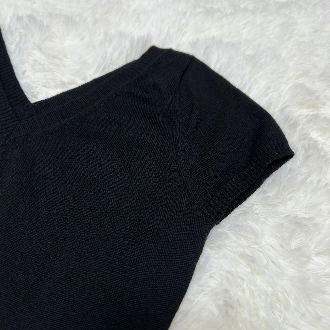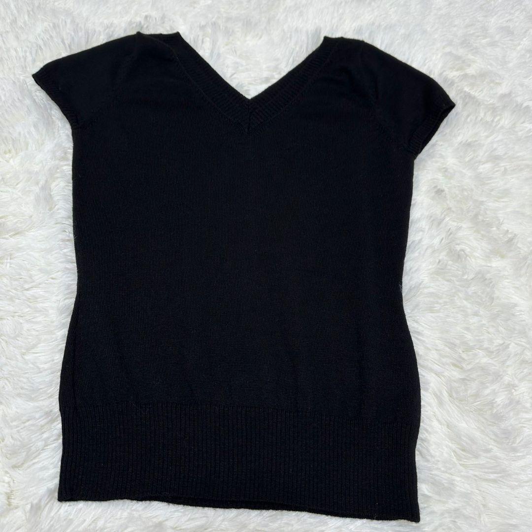 シンプルな黒のVネック半袖ニット、リブ編み裾でフィット感あり。