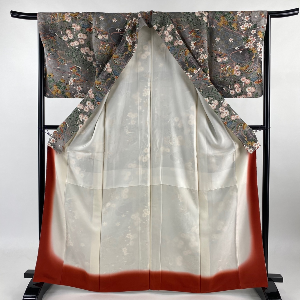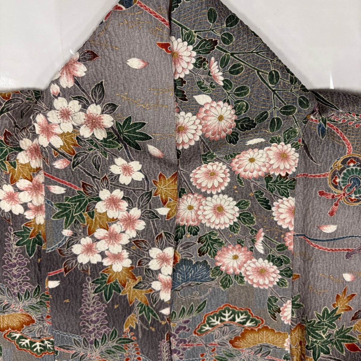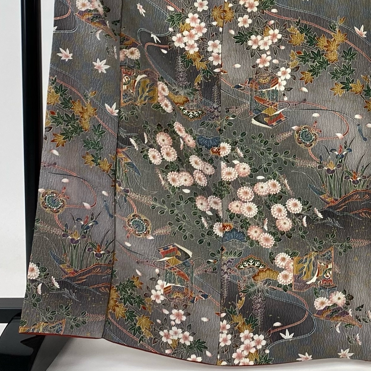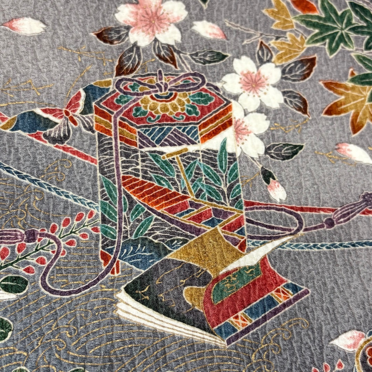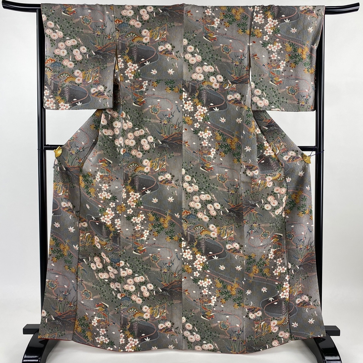 | 小紋 美品 秀品 貝桶 冊子 金彩 縮緬 灰色 袷 身丈166 裄丈66 M 正絹 【中古】 |