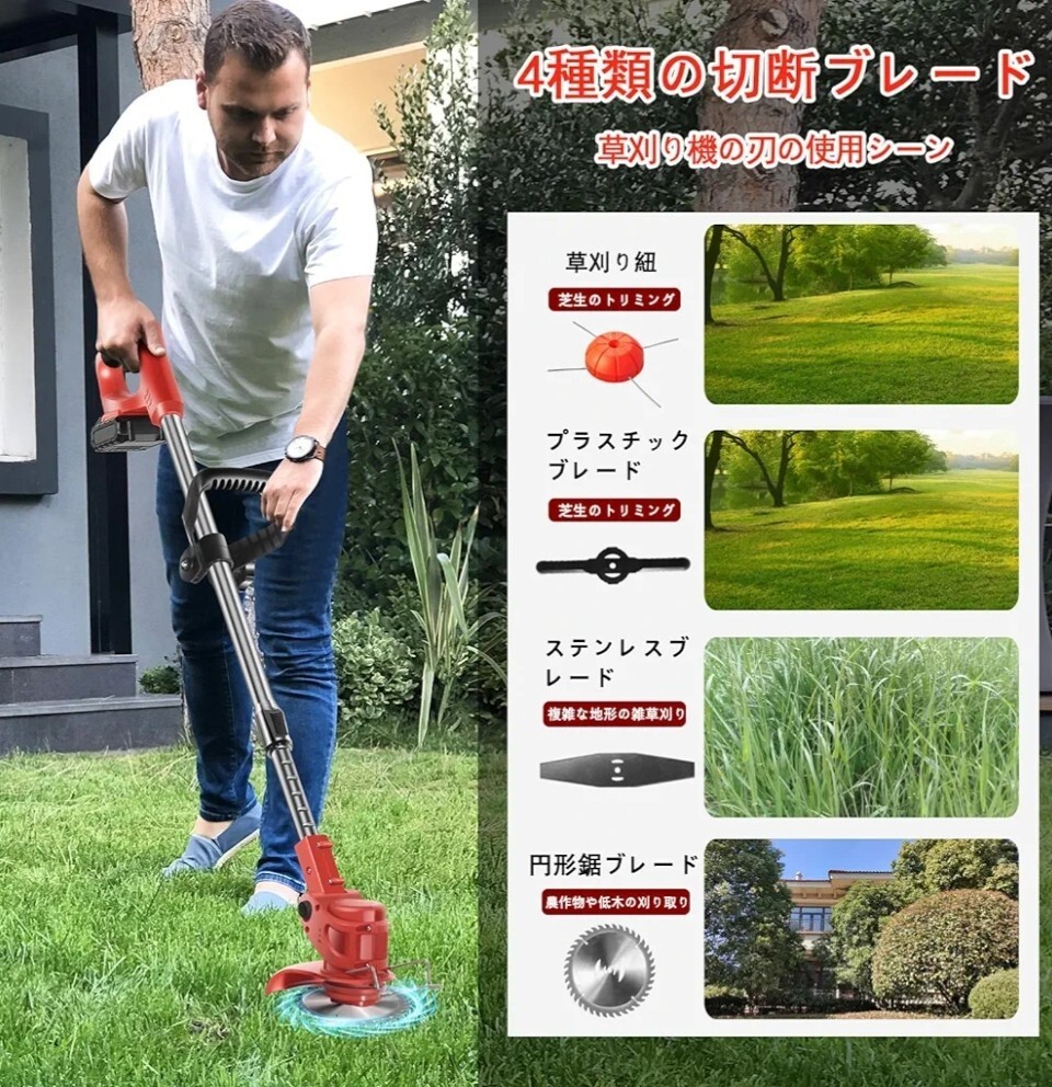 【4種類の多機能カッティングブレード】このバッテリー式草刈り機は、4種類の交換可能ブレードを装備し、様々なガーデニング作業に対応:丸ノコブレード:太い枝や固い雑草の切断に最適。菱形メタルブレード :生垣やしつこい雑草のトリミング向き。ナイロンカッターライン&プラスチックブレード:柔らかい草や軽い雑草専用設計。