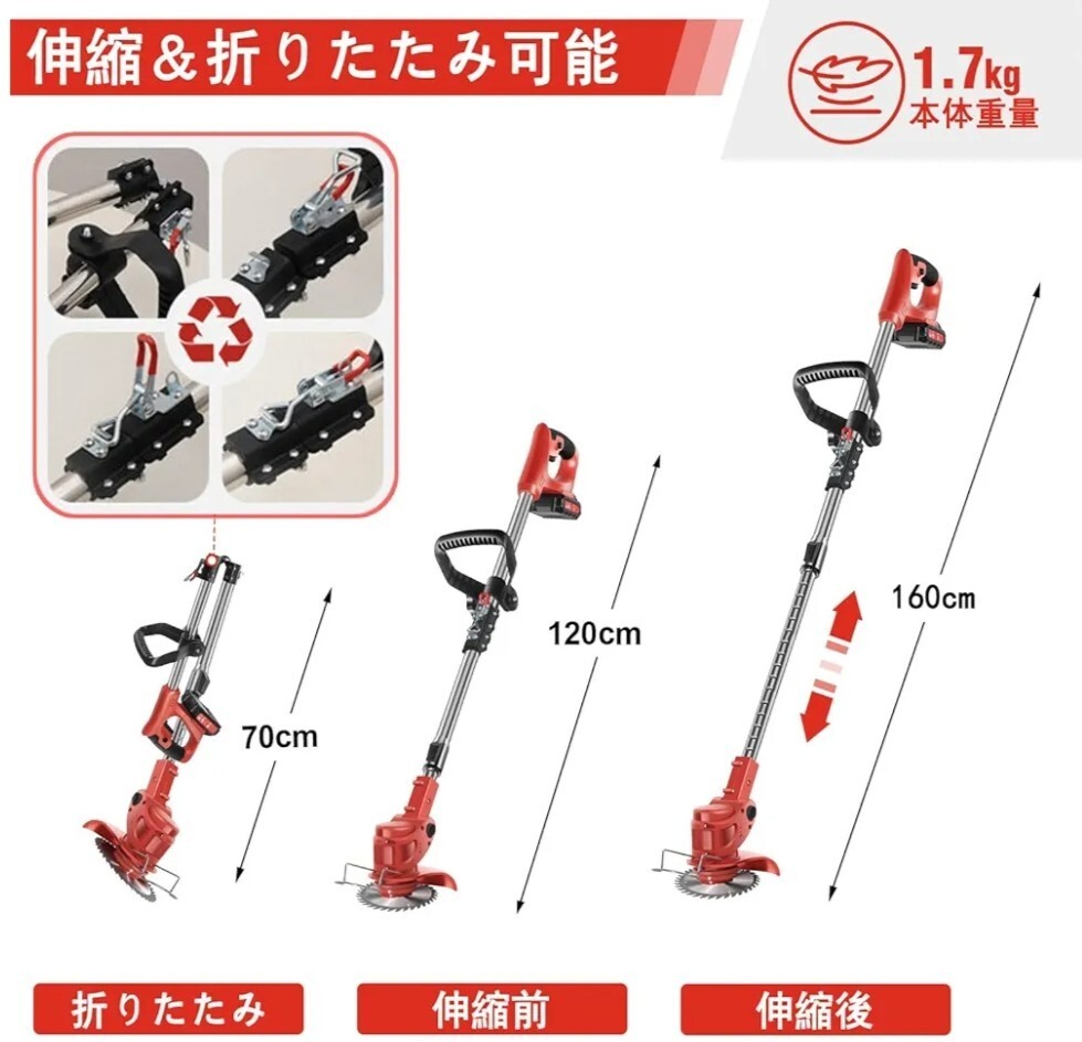【調節可能&折りたたみ式で便利】伸縮式シャフトは120cmから160cmまで伸びるため、異なる身長のユーザーが快適に作業できます。0-90°調節可能なヘッドにより、斜面や狭いスペース、手が届きにくい場所のトリミングが簡単です。さらに、この折りたたみ式設計により、収納や運搬が容易です。