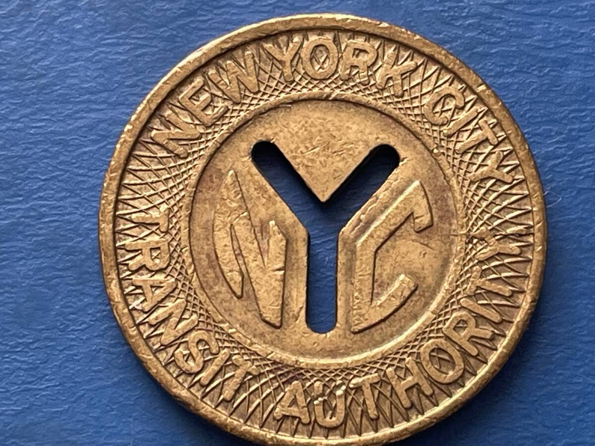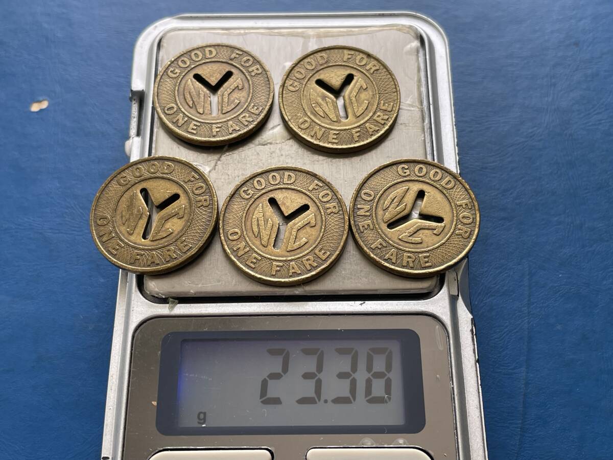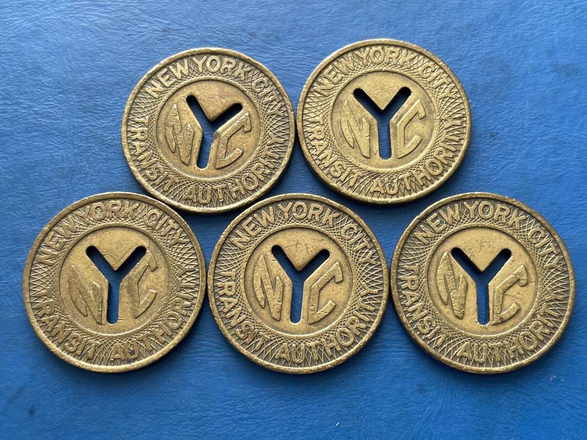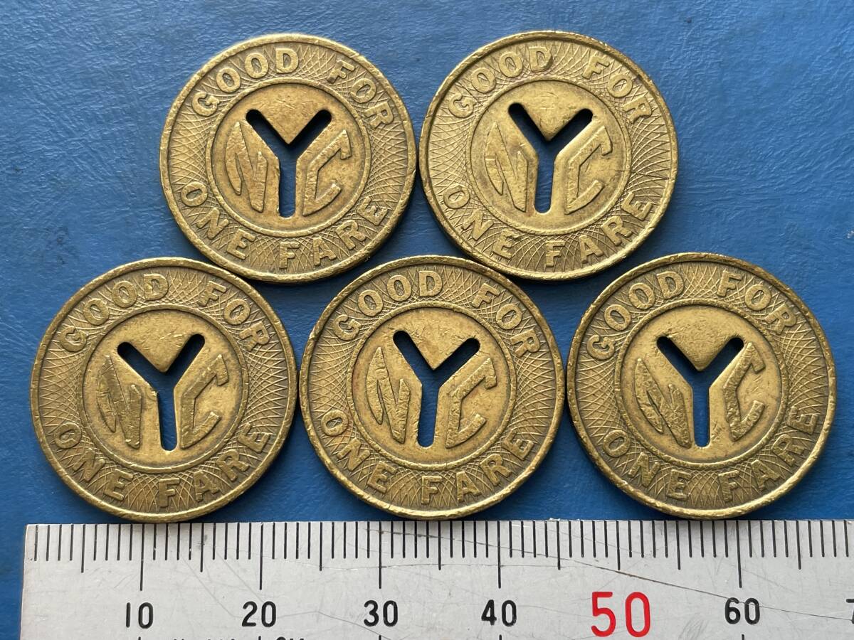 NYC(ニューヨーク)地下鉄トークン5枚セット:Y孔黄銅タイプNYC中央のY字がY孔 Aug 1165 | |||||||||||