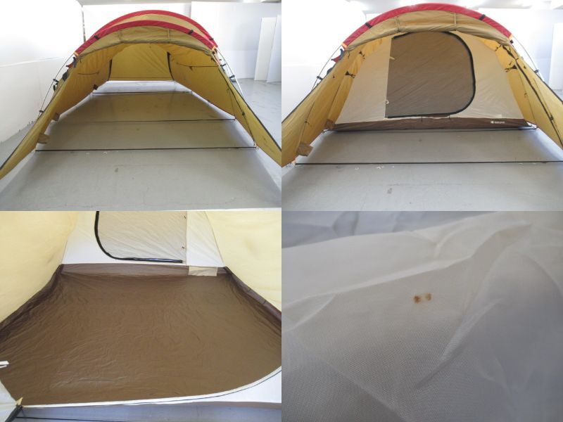【状態詳細】ポール曲がりあり、シミ汚れ箇所あり、フライシート入り口面上部に小穴箇所あり、グランドシート汚れあり、フロアマットシミ汚れ箇所あり