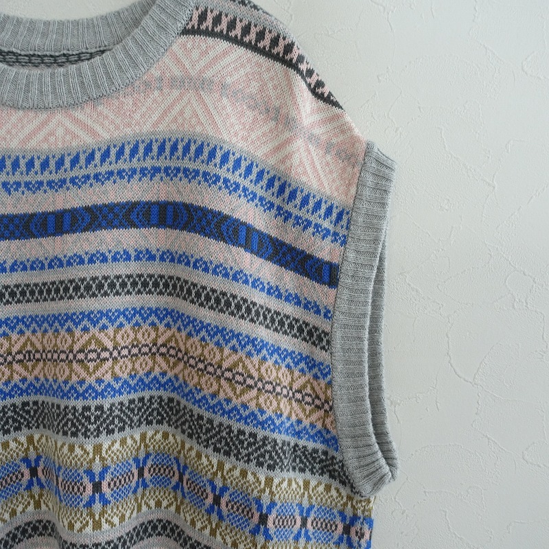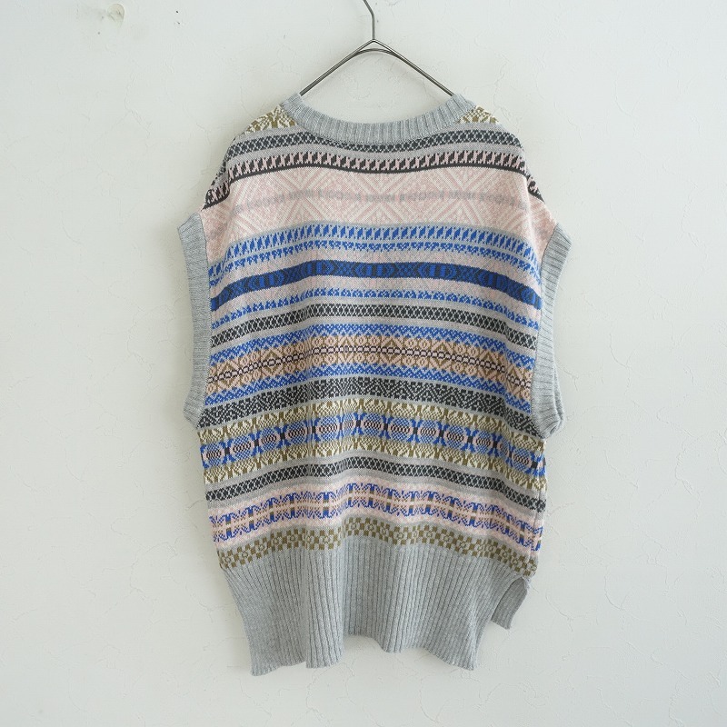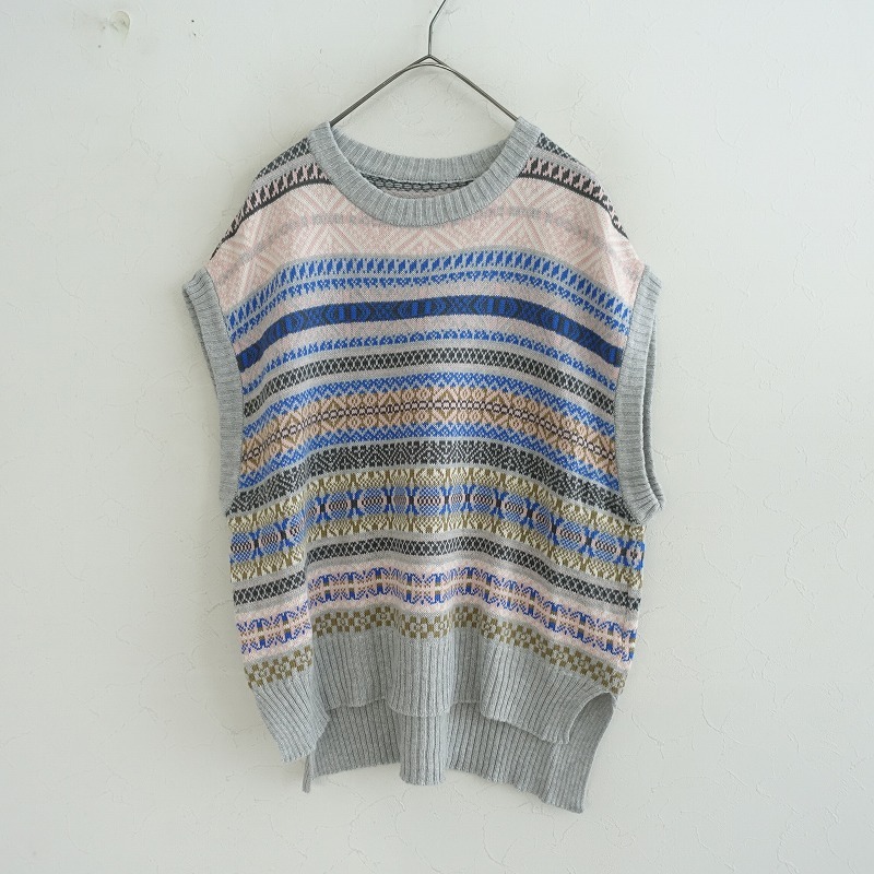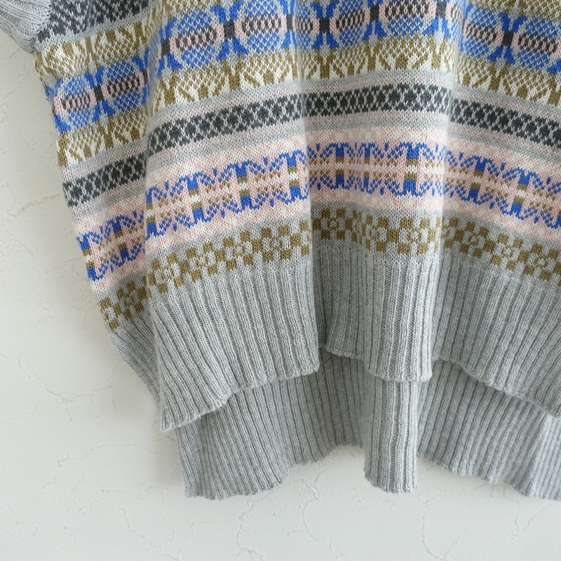NARUのフェアアイル柄コットンニットベストです。カラーはライトグレー×配色使いのフェアアイル柄です。コットンの薄手にジャカードニットで仕立てられています。クルーネックのプルオーバーベストで、ゆったりとしたサイジング。前後の裾丈が異なり、裾サイドはスリット入りです。ポケットはございません。 |