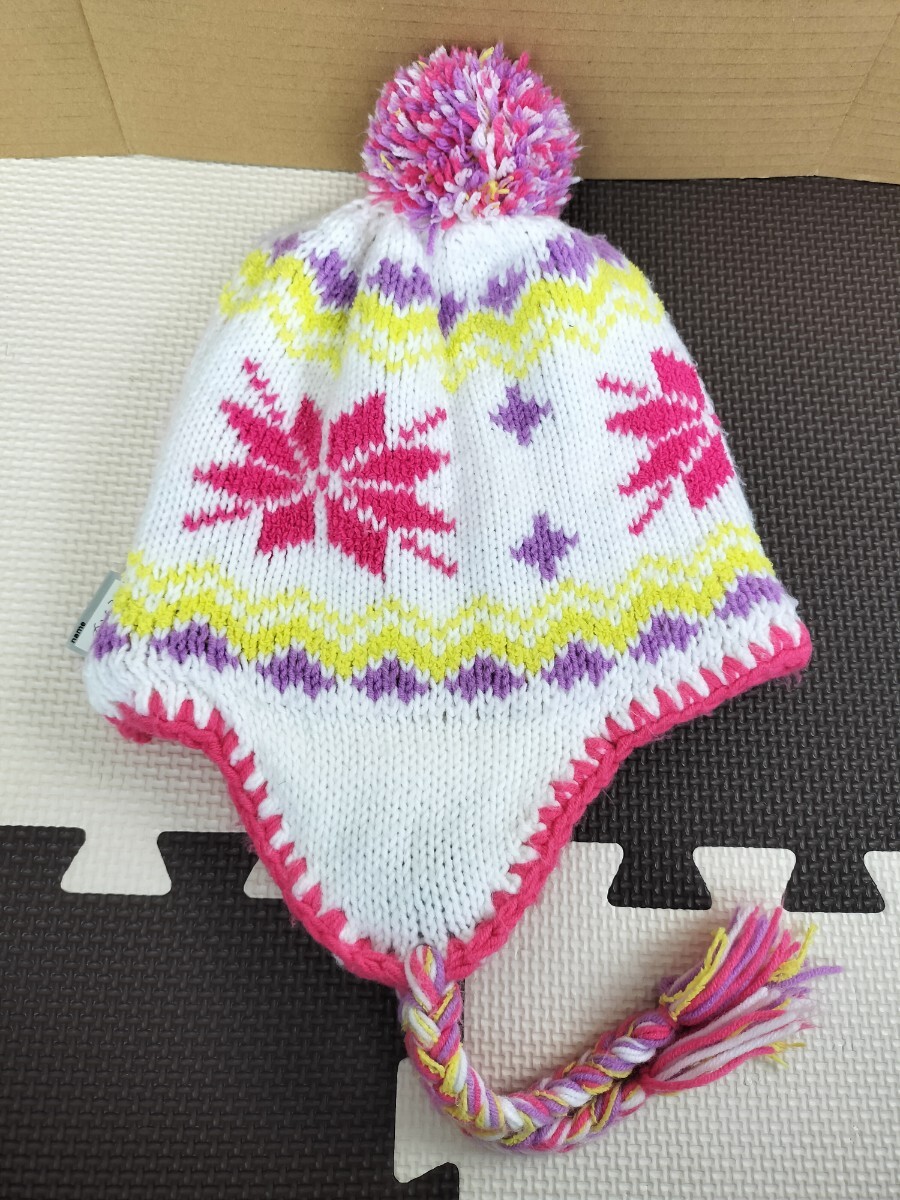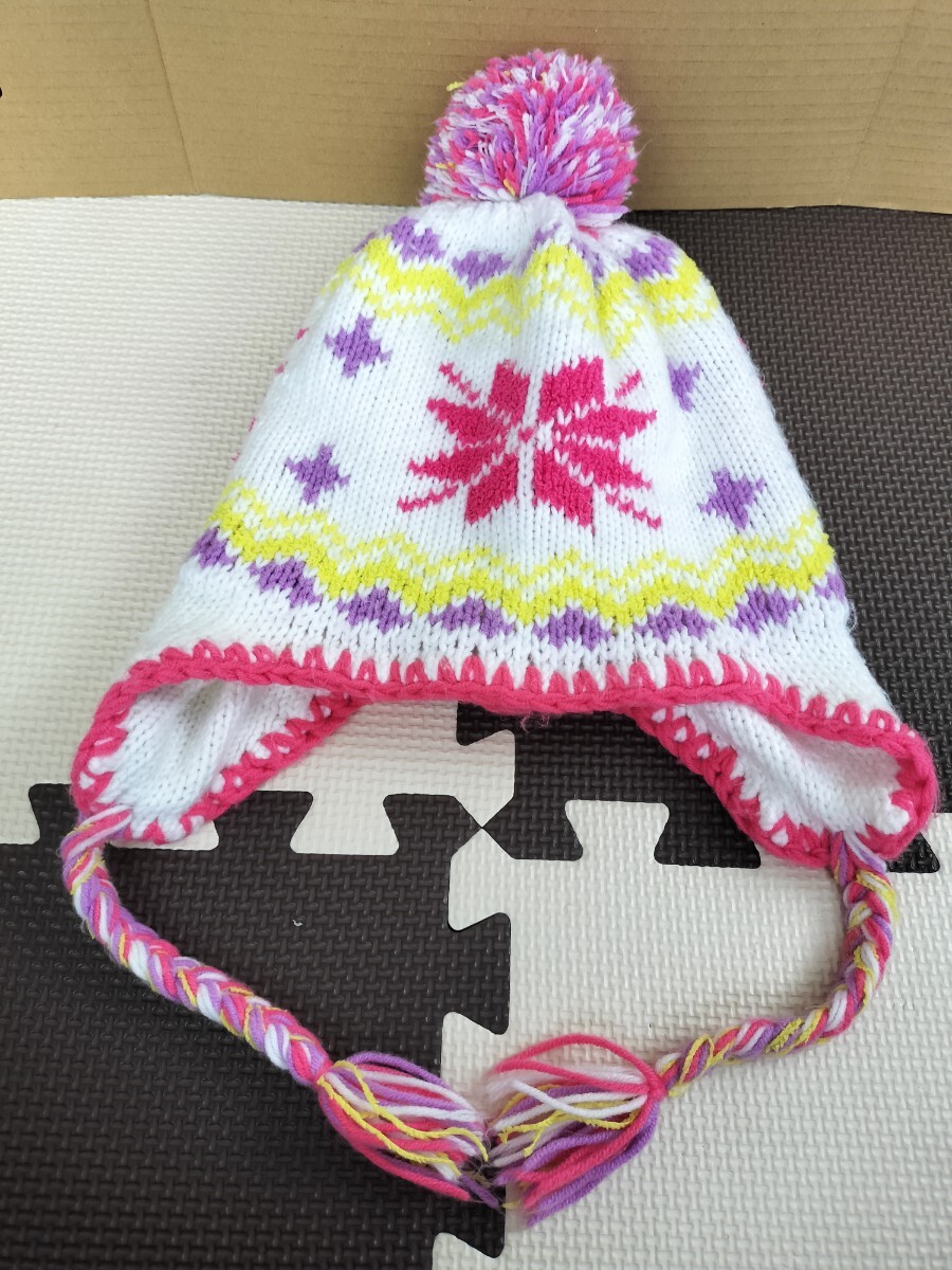 雪の結晶模様が特徴のカラフルなニット帽。ポンポン付きで、冬のコーディネートに最適。