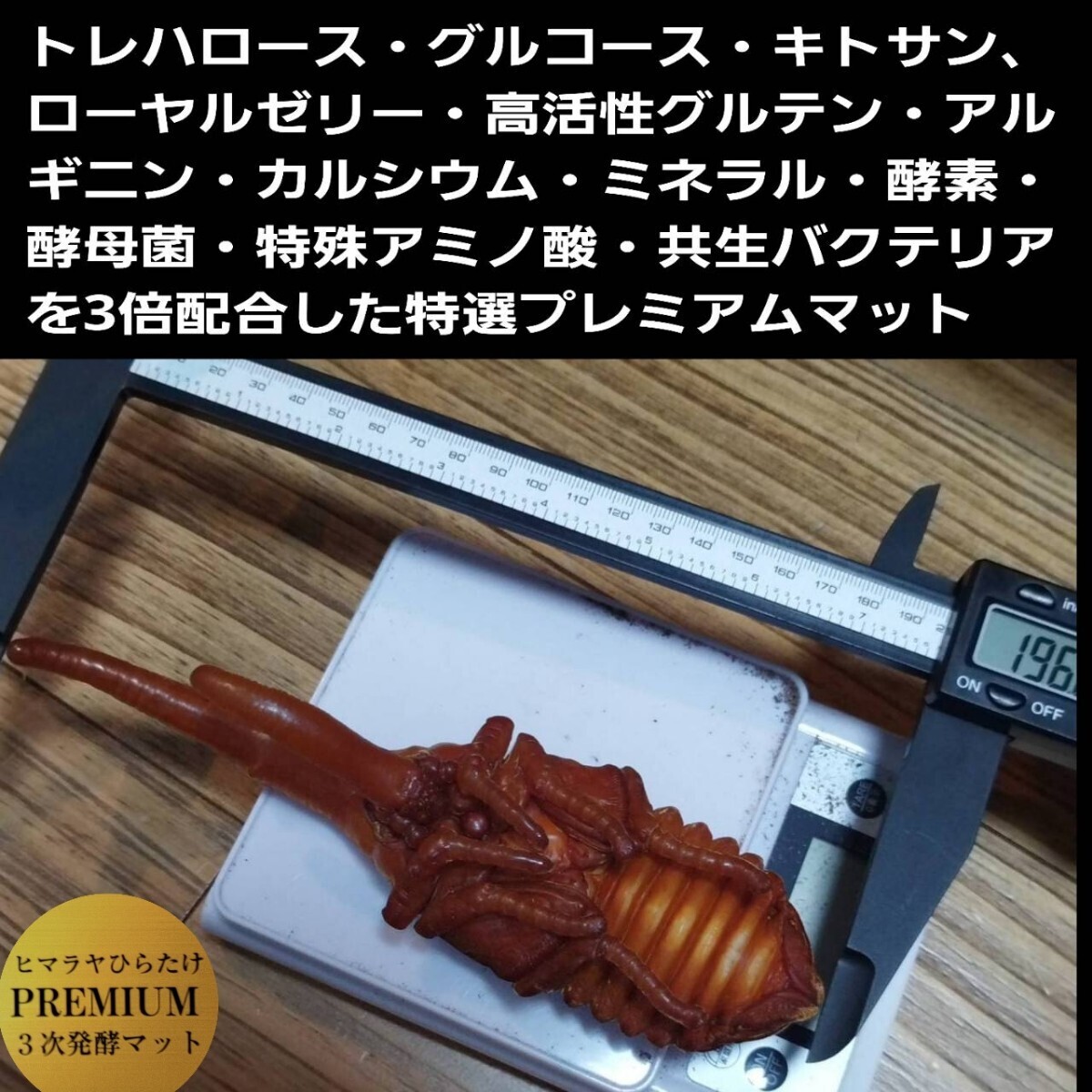 別途出品してある国産カブト用のノーマルの「ヒマラヤひらたけマット」を精密なマシーンでさらに微粒子に粉砕して幼虫が食べやすくしトレハロースやグルコース、キトサン、ローヤルゼリー、高活性グルテン、アルギニン、カルシウム、ミネラル、酵素、酵母菌、特殊アミノ酸などの栄養添加剤を贅沢に通常3倍配合した拘りの特選プレミアムマットです。