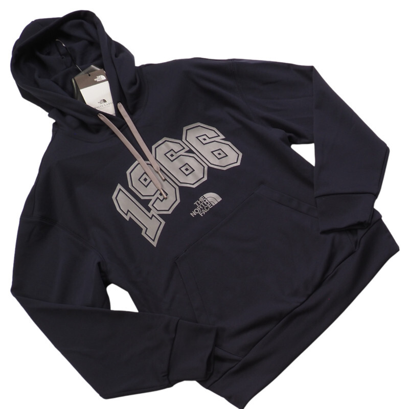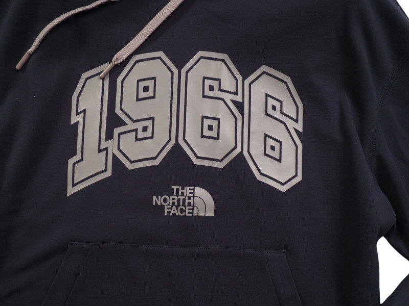 海外限定ノースフェイス、並行輸入モデルです。ふわっとした厚みのある段ボールニット生地を使用したフード付きプルオーバーです。裏フリース仕様です。1966アートワークがポイントです。