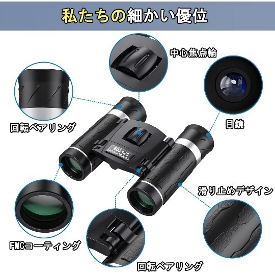 オペラグラス ライブ用&優れた光学構造:双眼鏡のプリズム構造はポロプリズムタイプを採用し、FMCブロードバンド緑膜とBAK4プリズムの組み合わせで、高い集光力と明るい画像を実現しています。双眼鏡の対物レンズ直径は25mmで、光透過率は99.8%に達し、明るさは4.84に達し、光の損失を抑え、暗くなりがちな屋内会場でも、臨場感あふれる明るい視界を楽しむことができます。