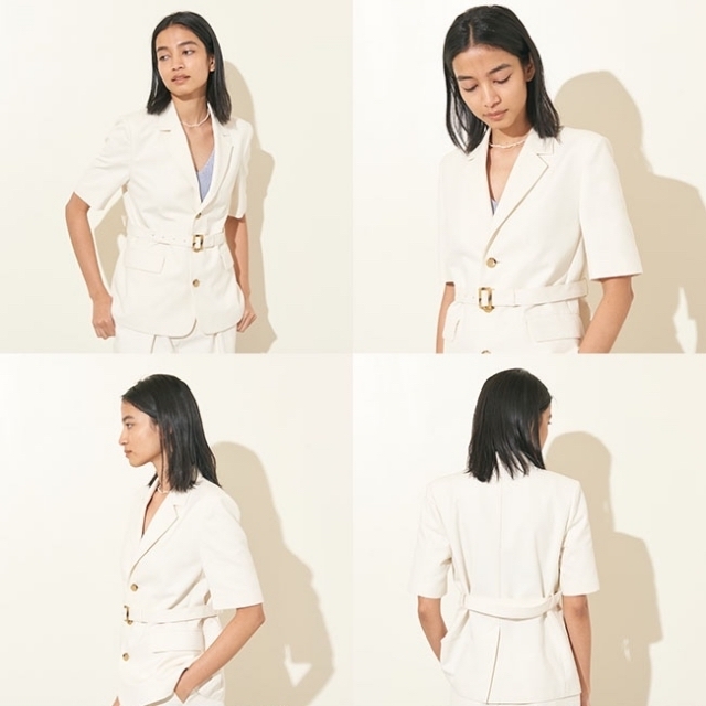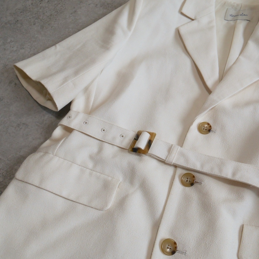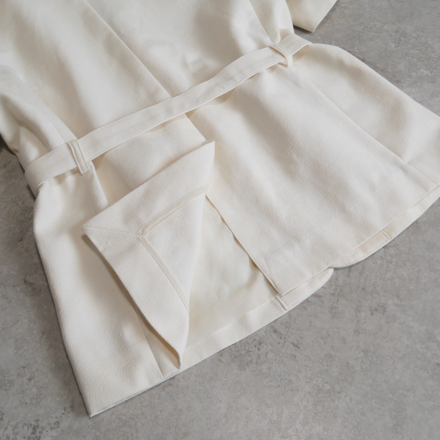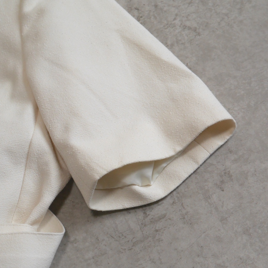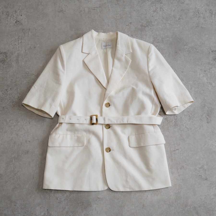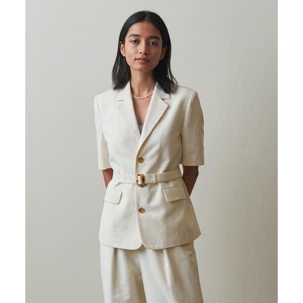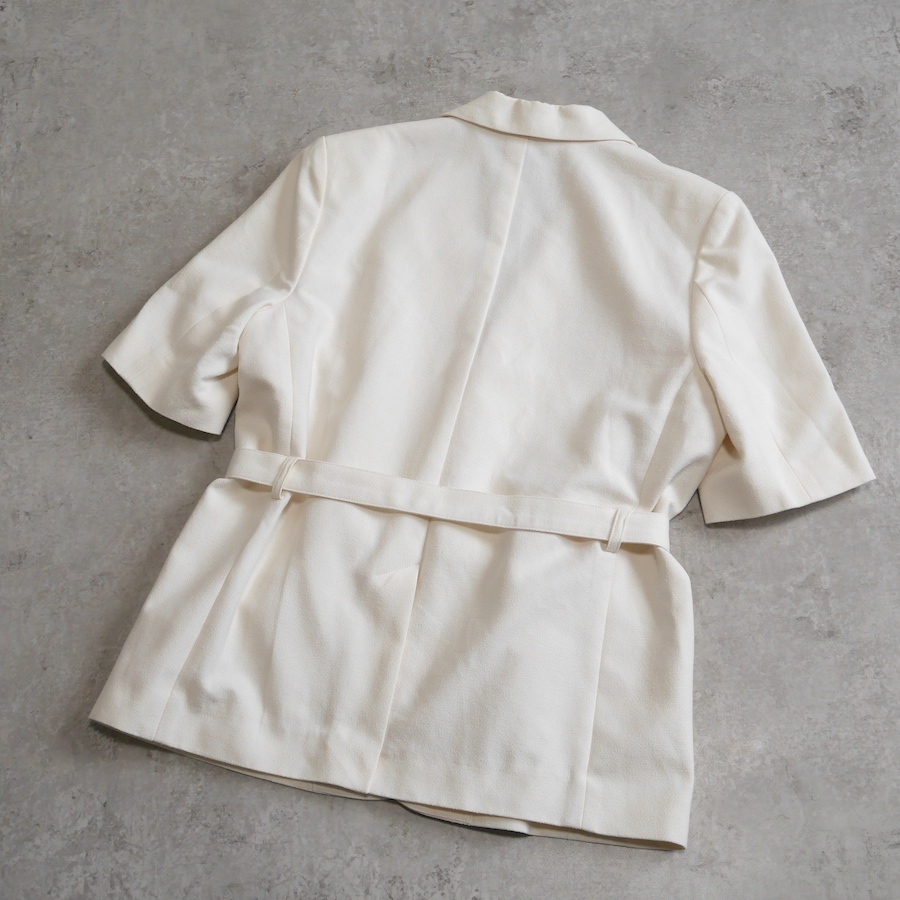 表情感のあるグログラン生地を使用したショートスリーブジャケット。 シンプルなテーラードデザインに、すっきりとしたショートスリーブと付属のベルトがミリタリーな雰囲気を演出します。 ラフに羽織るのはもちろん、共地のベルトでウエストをぎゅっと絞った着こなしもさまになります。様々なボトムスとバランスの取りやすい着丈で汎用性の高い一着です。 定価26400円です。