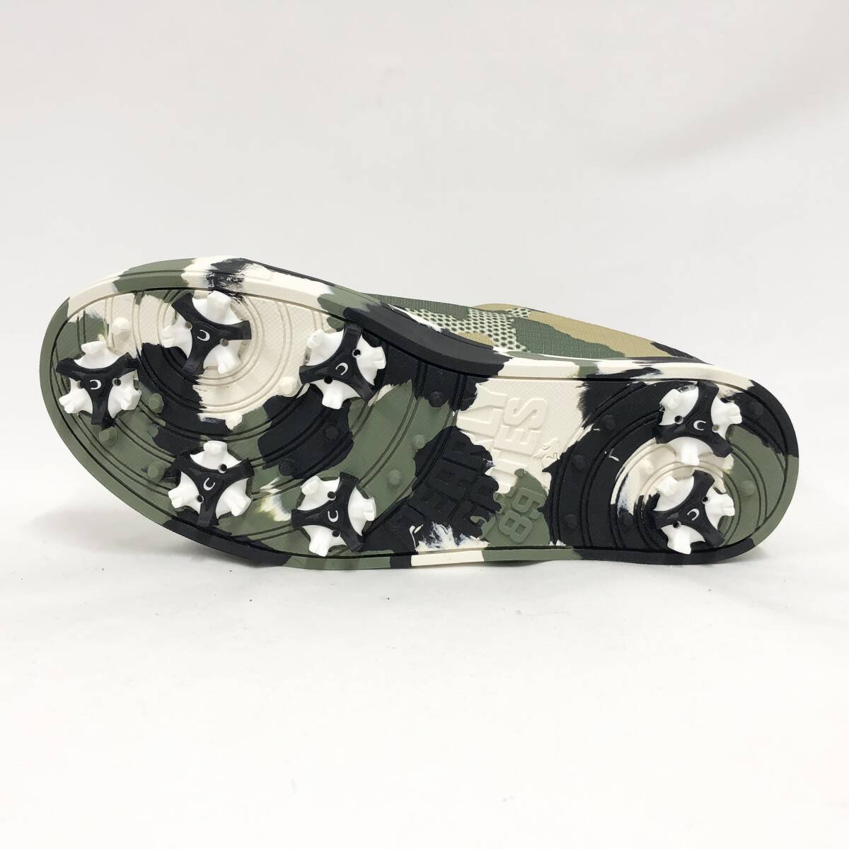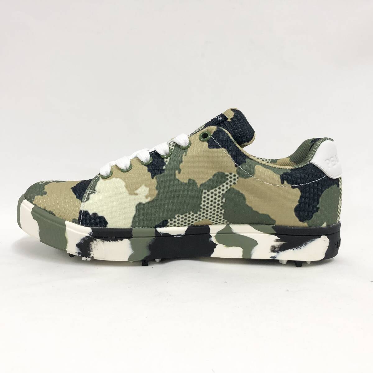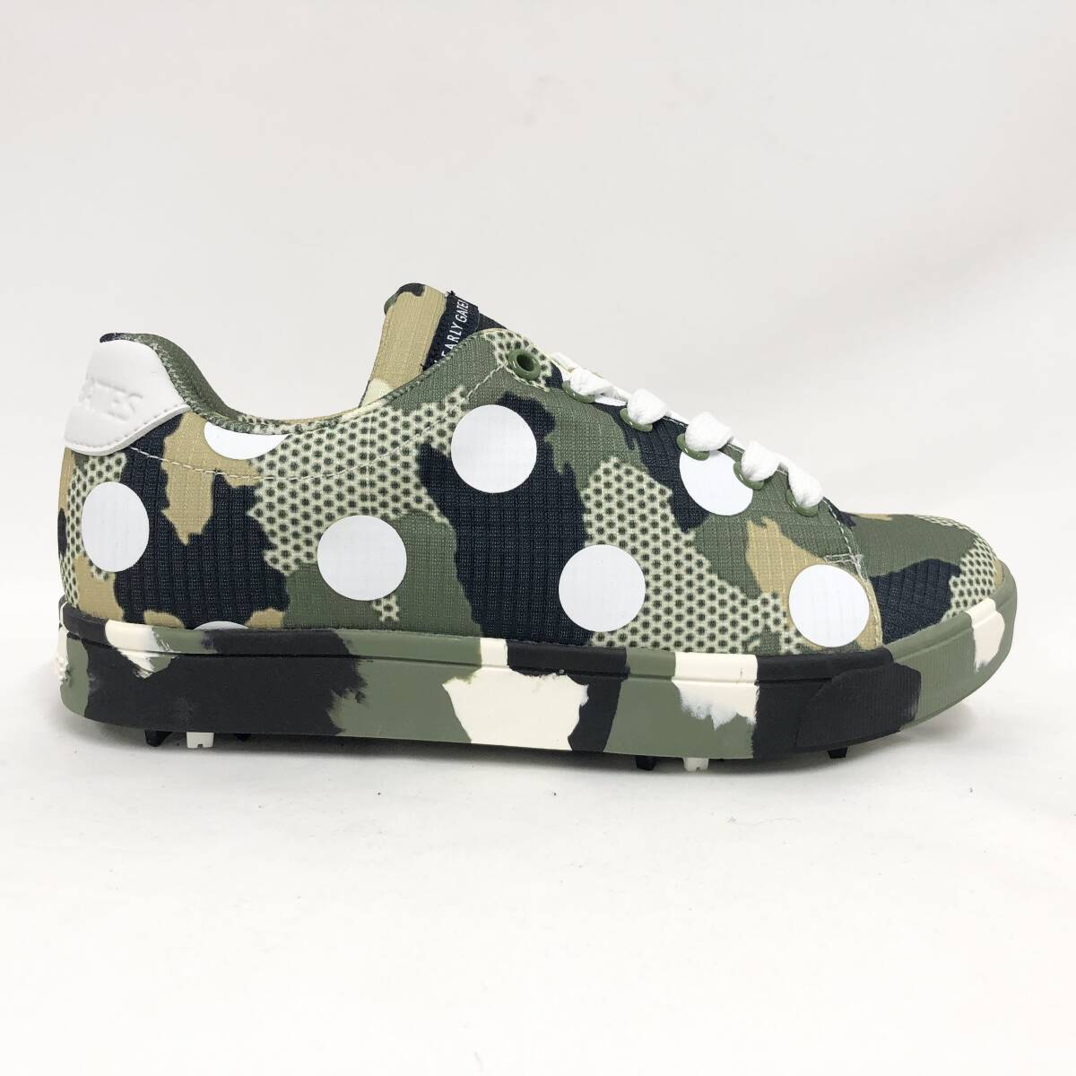 森と自然に溶け込みながら足元からしっかりと個性を輝かせる、CAMO柄プリントのローカットゴルフシューズ。一新したカモフラージュパターンにホワイトのドットでPOPなエッジを効かせて、夏らしくデザインしています。安定性とグリップ力に優れたアウトソールを採用し、適度な柔軟性と剛性を兼ね備えスイング時の足の動きを最適化しスムーズな体重移動を実現します。歩行しやすい踵全体を包み込む確かなホールド感のある構造で、快適なはき心地を得られます。持ち運びや保管に便利な巾着タイプの収納バッグと、レンチ付きです。