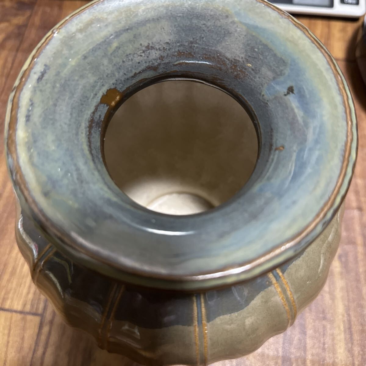 特徴: 口が広く、胴体が丸みを帯びた形状で、表面には縦縞模様が見られます。釉薬は上部が青みがかった灰色、下部が茶色がかった灰色で、縦縞の部分には金色のような光沢があります。