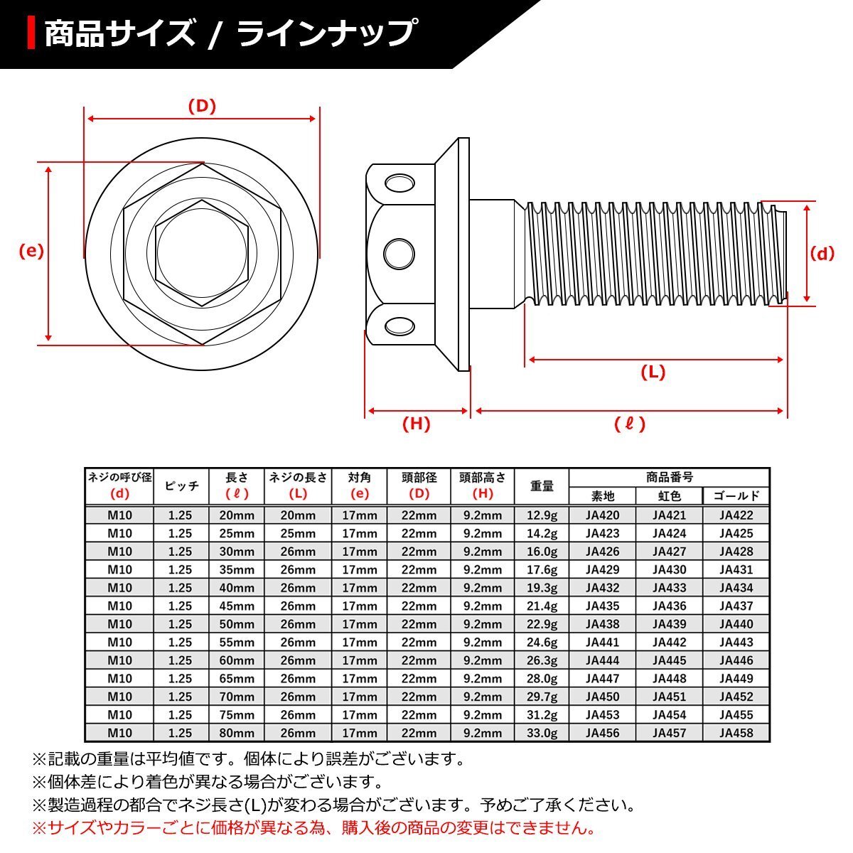 | 64チタン ホールヘッド フランジボルト 数量:1個売り 材質:64チタン 頭部形状:六角ナット型 適合工具:レンチなど 商品サイズ:M10×65mm P1.25(詳細は画像に掲載) ネジの長さ:26mm(告知なしで変更の時あり、詳細のサイズが必要な場合は要問い合わせ。ロットにより全ネジ、半ネジが異なりますが、選ぶことができません。) 適合車種:汎用タイプ。サイズ等でご判断ください。なお、適合車種に関しての回答は致しておりません。 商品カラー: 焼きチタンカラー、虹色 ※サイズやカラーごとに価格が異なる為、購入後の商品の変更はできません。 また、ご購入数しかお取引ができません。 数量以上ご必要の場合は、ご入札前にご質問ください。 在庫がございましたら別途出品させていただきます。 |