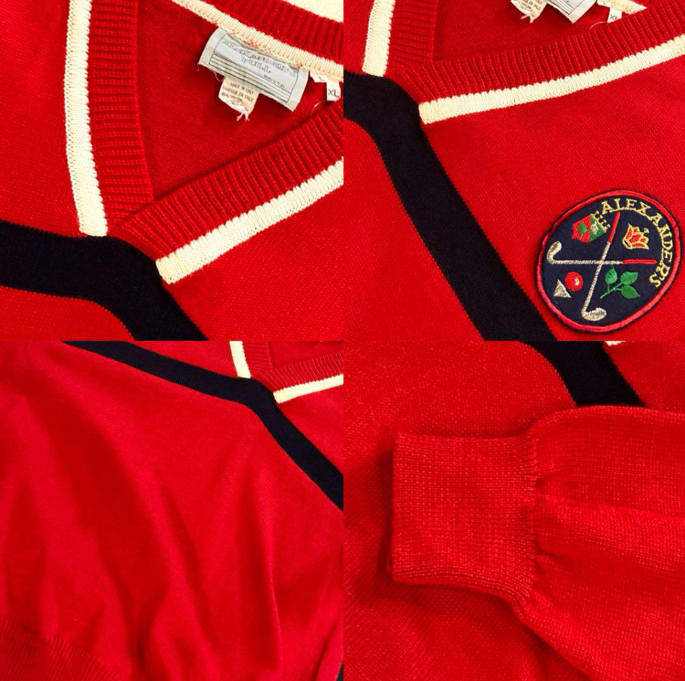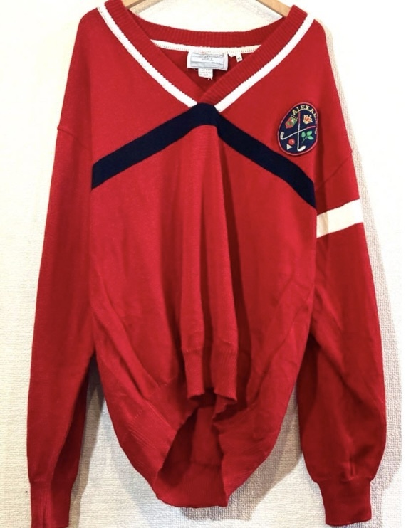 レッドカラーのチルデンタイプのセーターで、ゆったりとしたシルエットや色柄の綺麗なデザインになっています。