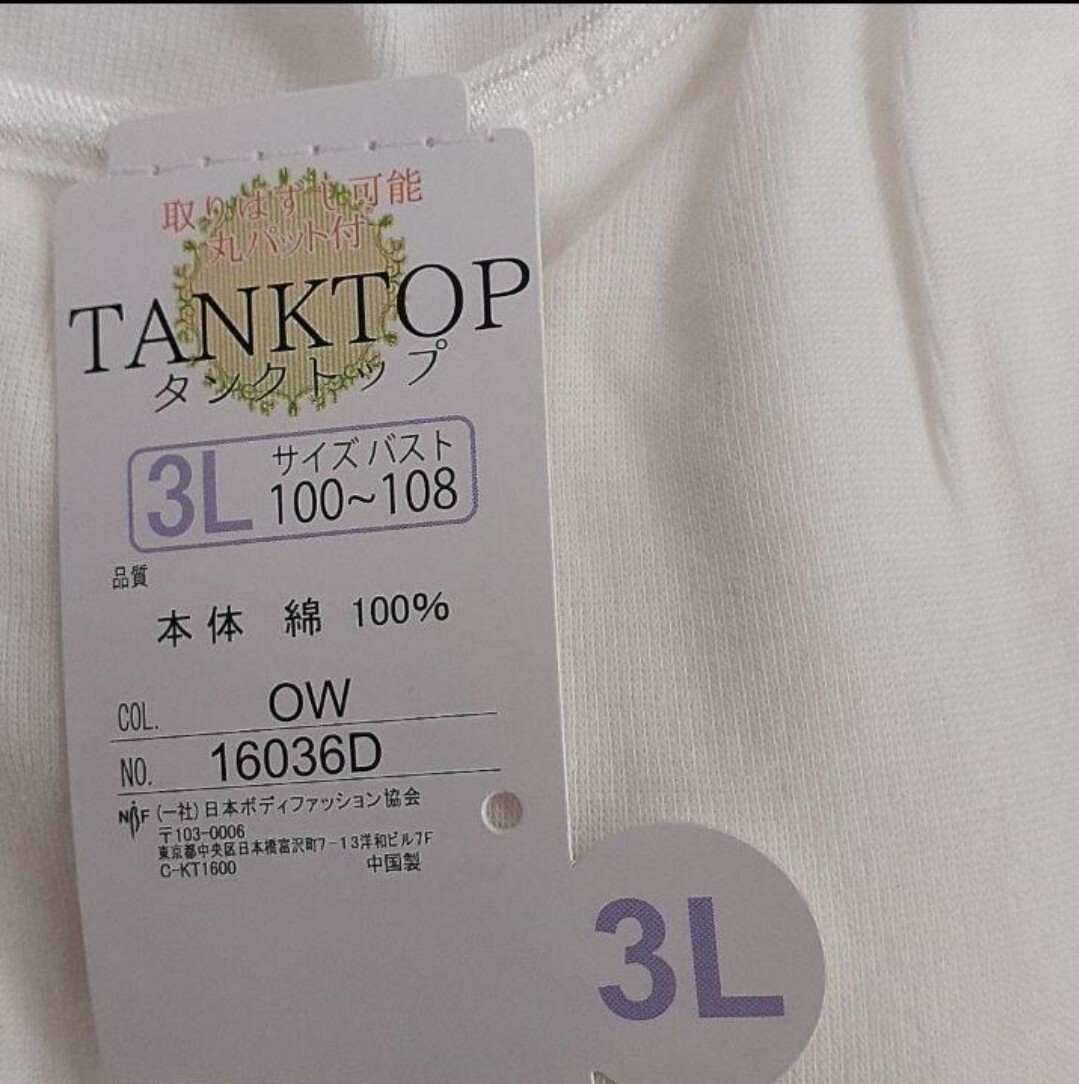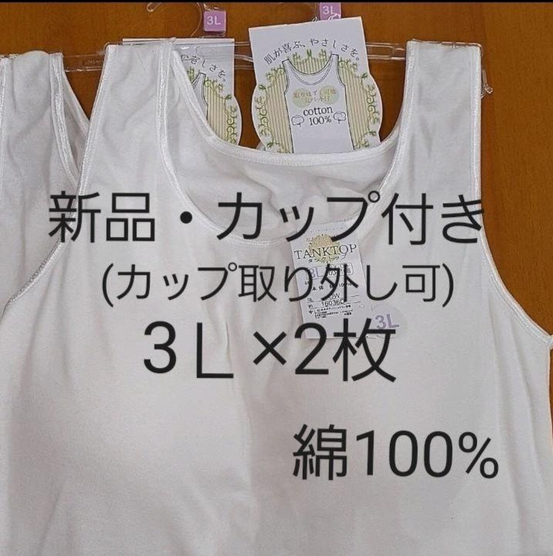☆新品綿100%☆3Lレディースカップ付きタンクトップ白2枚(カップ取り外し可)
