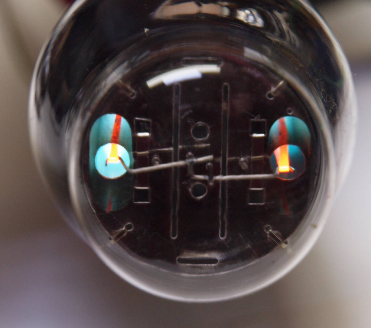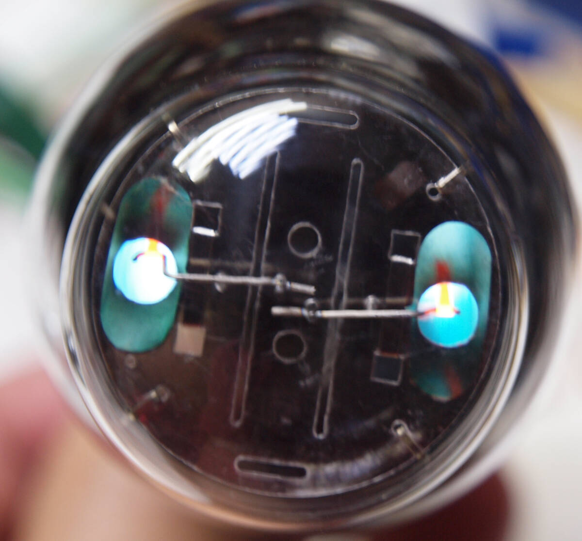 その後、高圧をかけるとフィラメントとプレート間で水色に放電します。