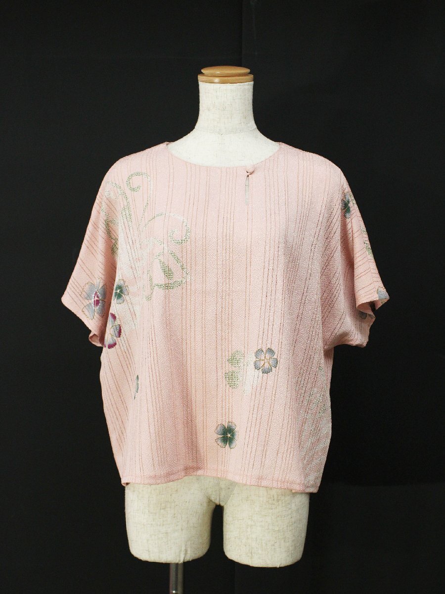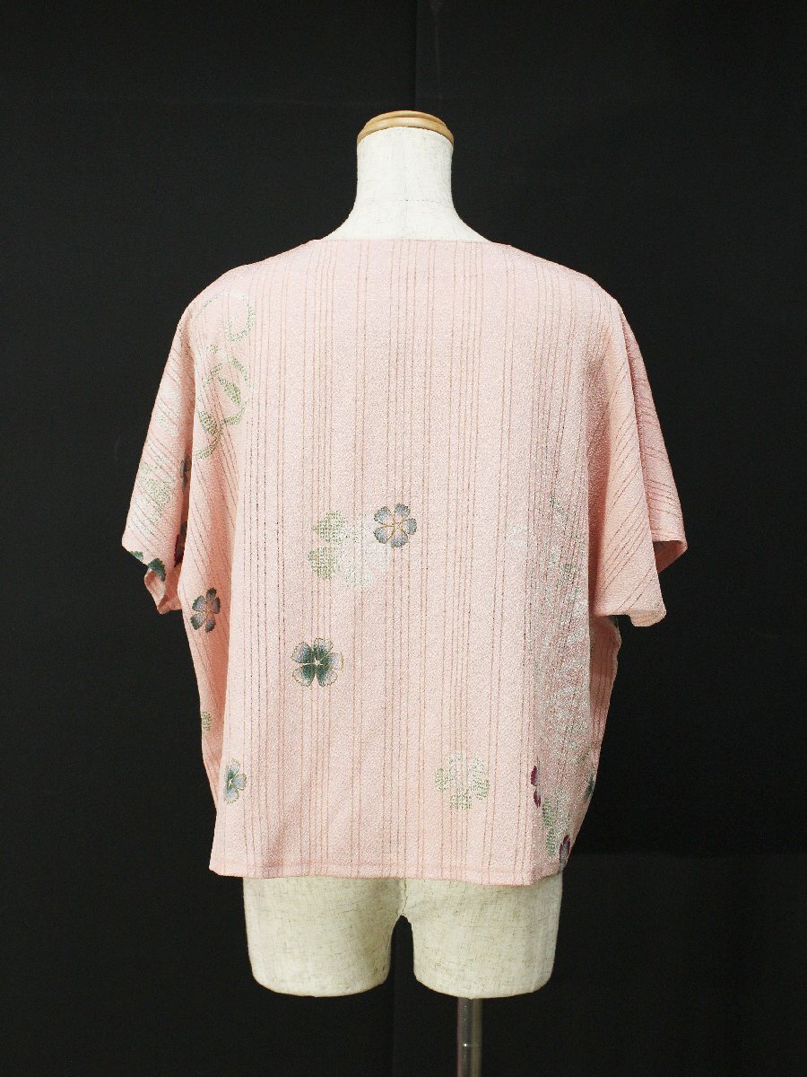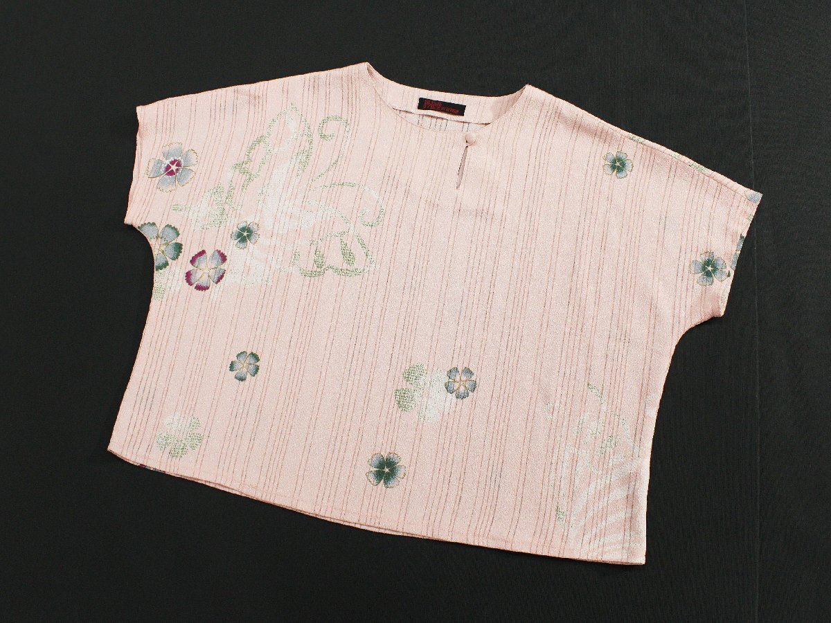 美品 詩仙堂 洗える絽ちりめん織り花柄半袖ブラウスプルオーバー ピンク系 rl783