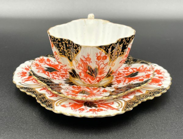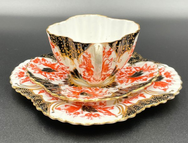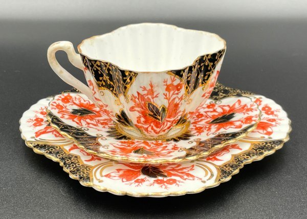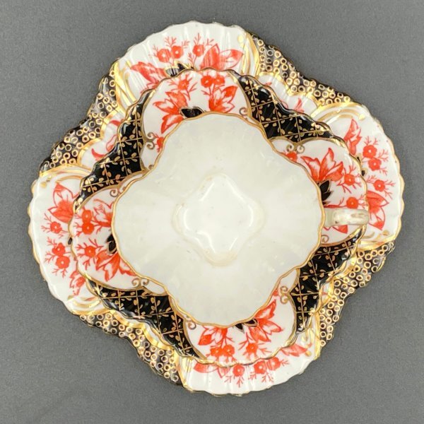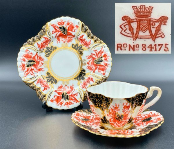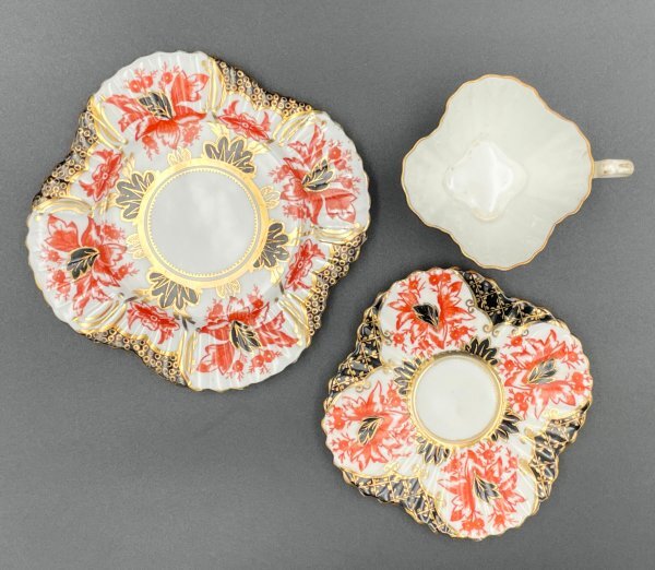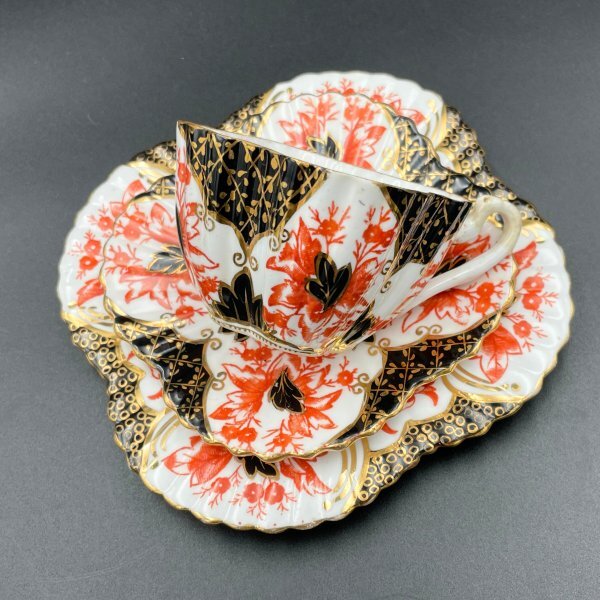 Wileman(ワイルマン/Shelley)アンティークトリオ(カップ・ソーサー・プレート) Alexandraシェイプ 豪華金彩×赤黒彩 1886年頃 M037