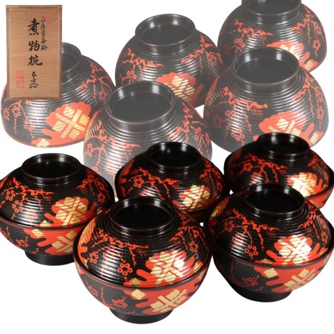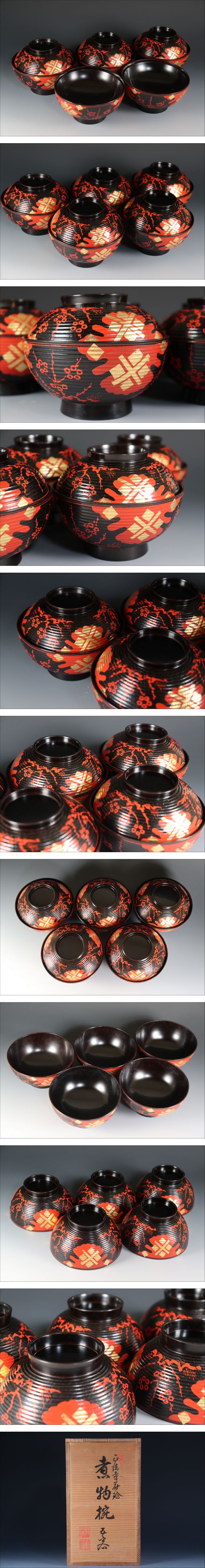 商品説明 | 商品名:蔵出し品 浪花屋漆器店 輪島塗 正清寺蒔絵 煮物椀 5客 付属品:共箱あり。 サイズ:高さ10,5cm、口径13,5cm、高台7cm。 状態:無傷になります。 |