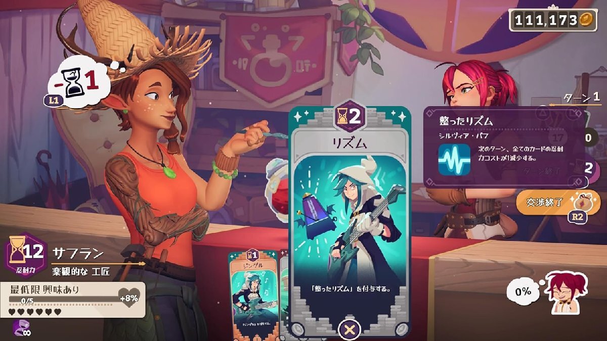 ・客との交渉は、デッキを組んだカードを使用して行われる。「売り口上」や、「興味を引く」などで客の関心度を高めていこう。