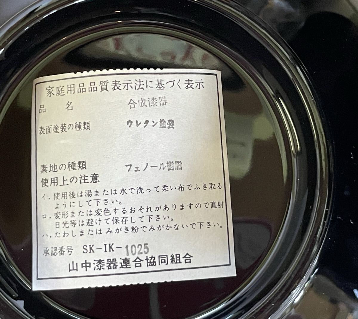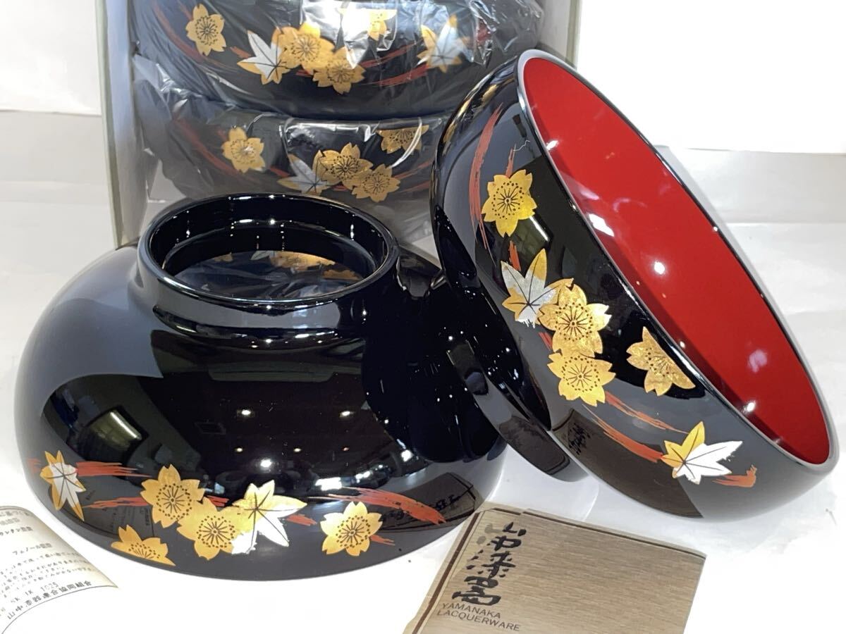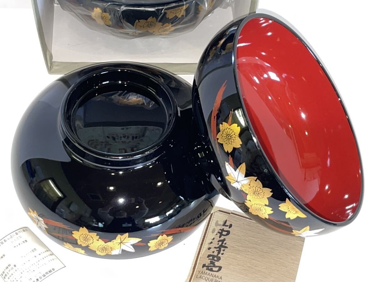 山中漆器 浅めの丼 重厚 黒 内側 朱色 ライン 金彩 春秋