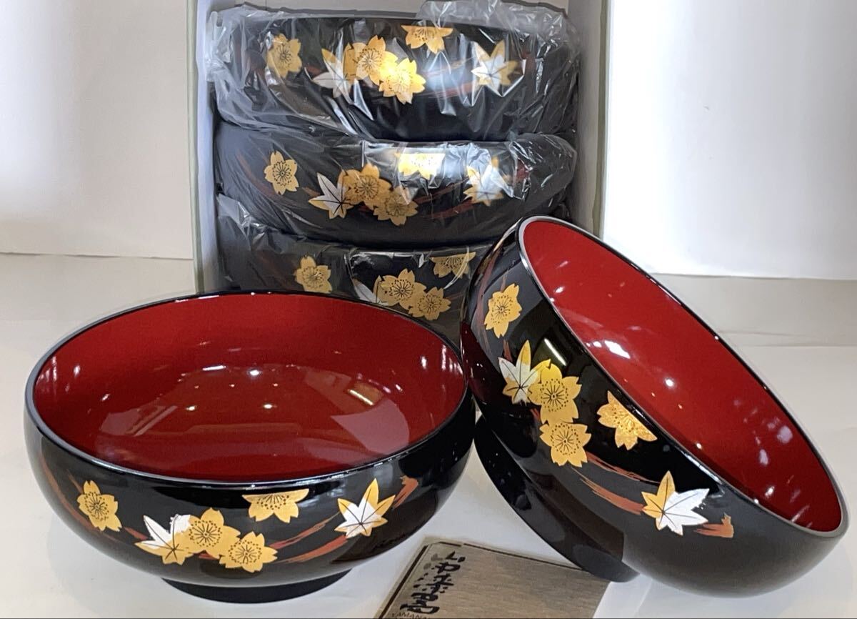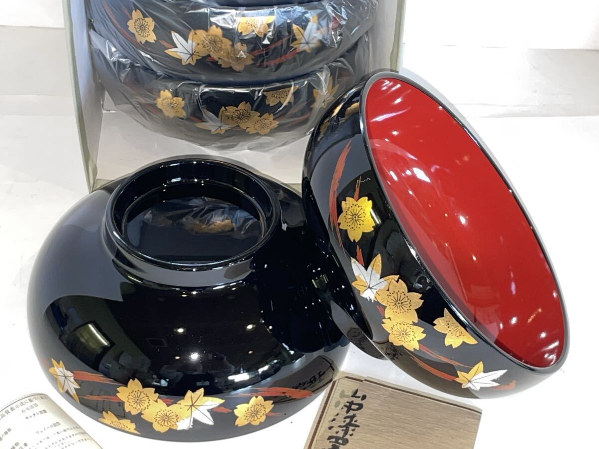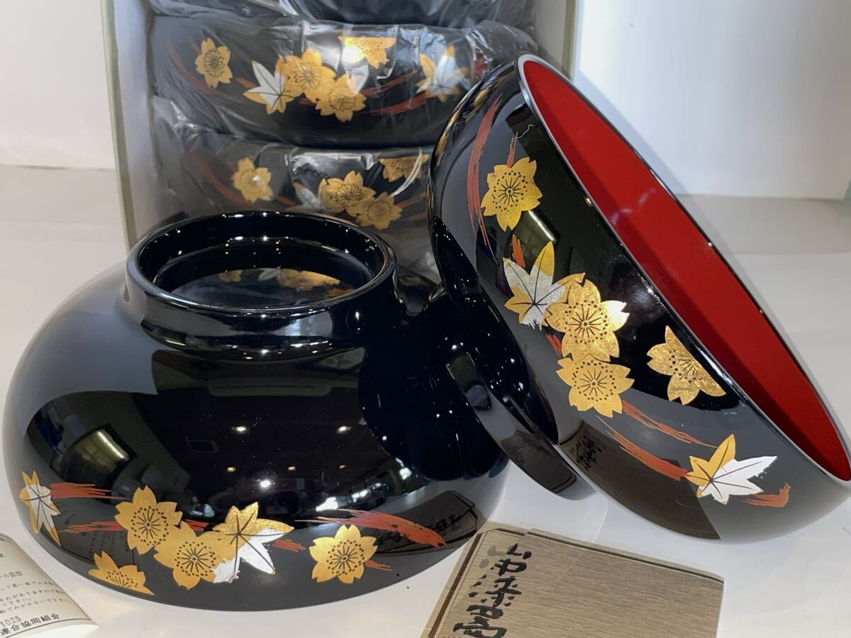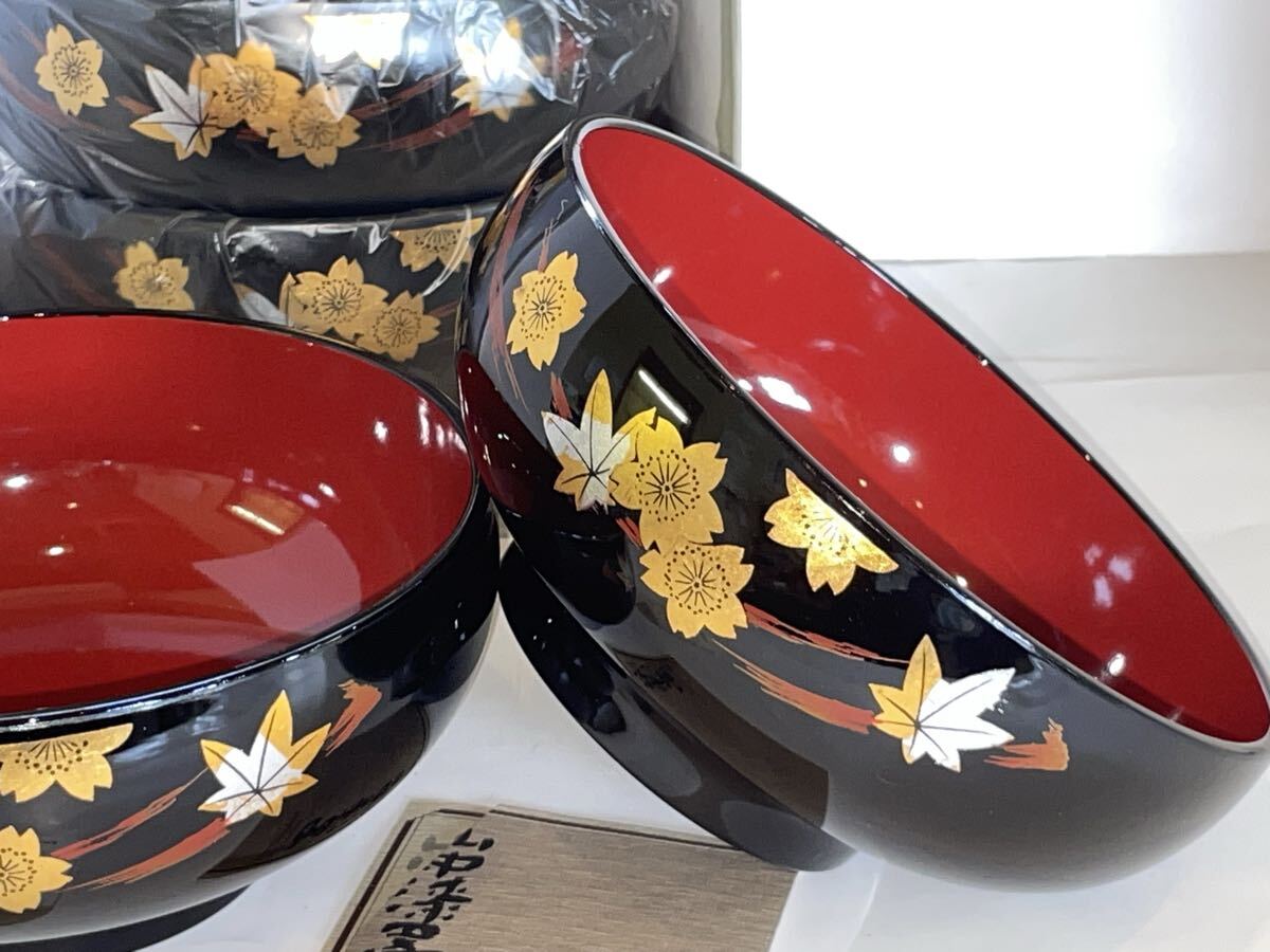 * 美しい漆塗りが特徴で、特に椀類は日常使いにも適した丈夫さと美しさを兼ね備えています。 * 画像のお椀は、黒地に金色の桜と紅葉のような模様が描かれており、内側は鮮やかな赤色で、伝統的ながらも華やかなデザインです。