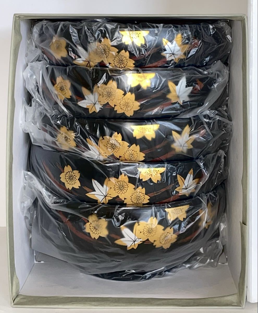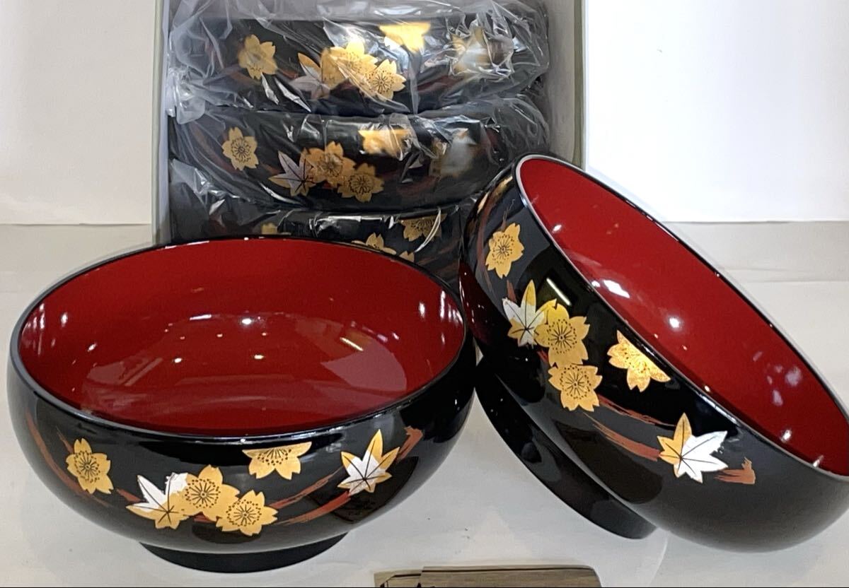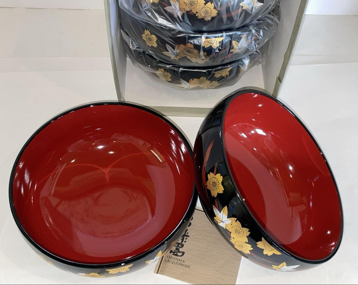 * 美しい漆塗りが特徴で、特に椀類は日常使いにも適した丈夫さと美しさを兼ね備えています。 * 画像のお椀は、黒地に金色の桜と紅葉のような模様が描かれており、内側は鮮やかな赤色で、伝統的ながらも華やかなデザインです。