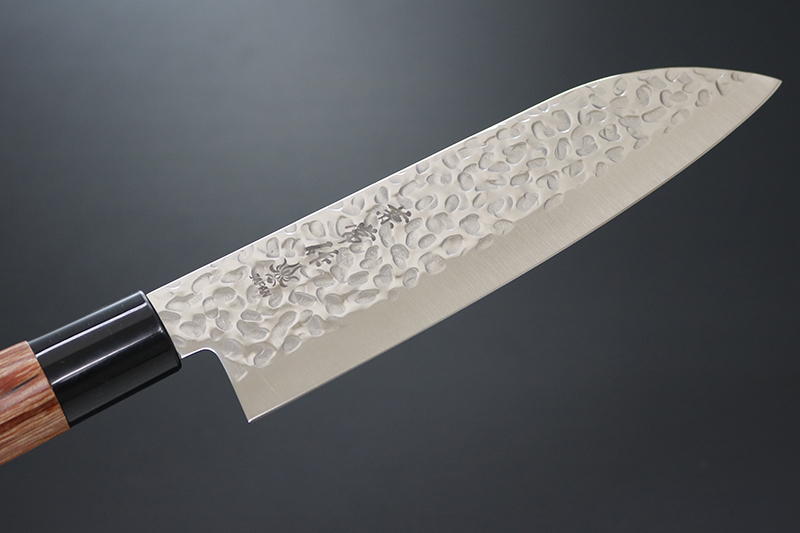 和包丁風のハンドルスタイル。ハンドル材は美しい木目調の赤合板材を使用。よく切れサビにも強いステンレス鋼DSR-1K6の単層鋼(全ステン)。鋭い切れ味とメンテナンスの良さを兼ね備えた包丁。鎚目磨きは風合いが美しいだけでなく、食材がブレード面にくっつきにくいこともあり、切れ味を助長し切離れよく快適にカットできます。