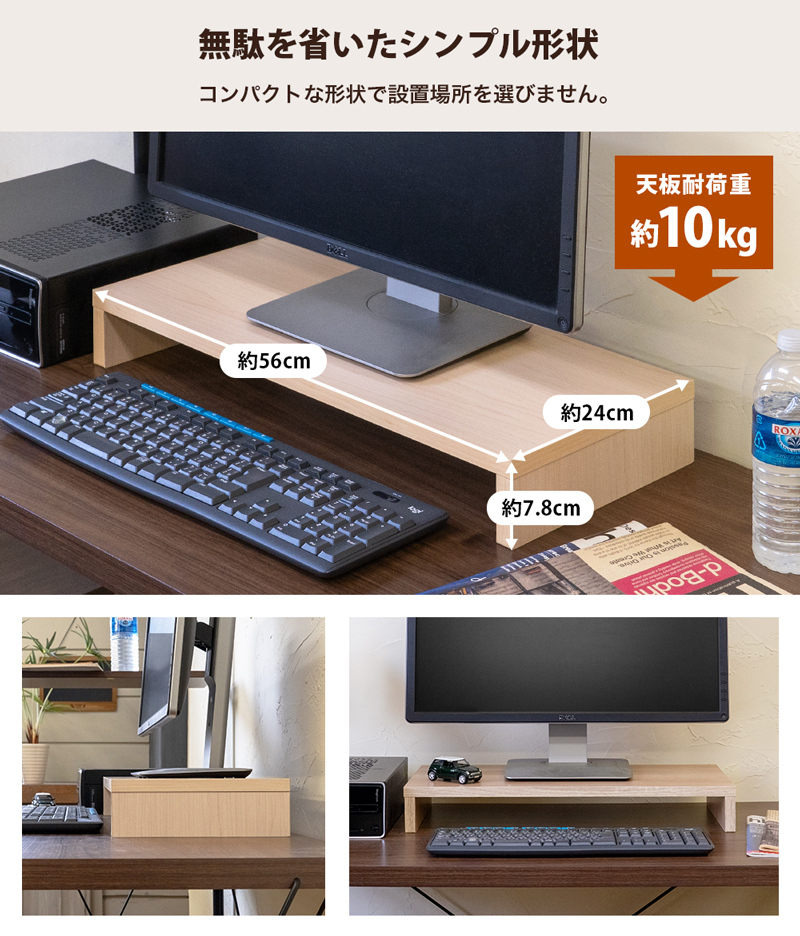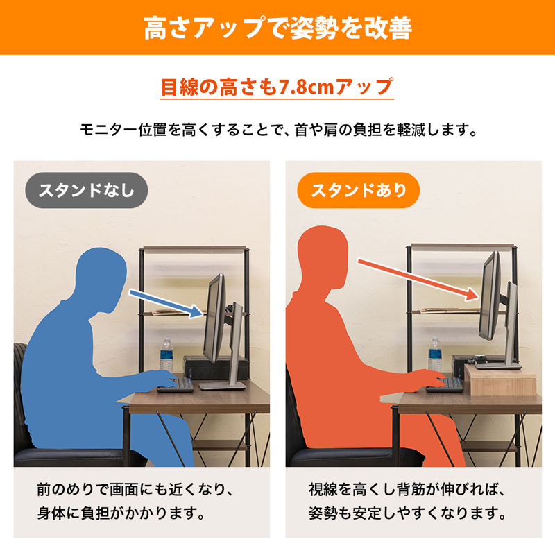 | 商品説明 | 組立品(約5分) モニター位置を高くして、首や肩の負担を軽減! 木の温もりを感じるナチュラルデザインのモニタースタンドです。 作業後はキーボードを奥へ。デスクがすっきり広く使えます。 モニター位置を7.8cmアップし、姿勢改善をサポート。 天板下にキーボード収納可能でデスクを有効活用できるモニタースタンド。 木目柄のシンプルデザインでオフィス・自宅どちらにも対応。 |