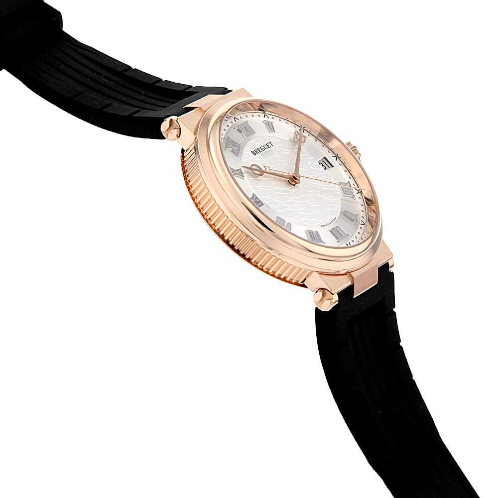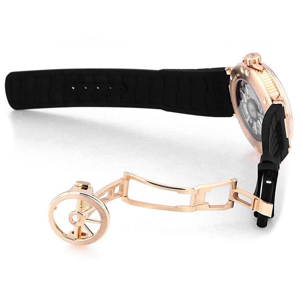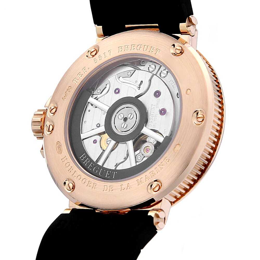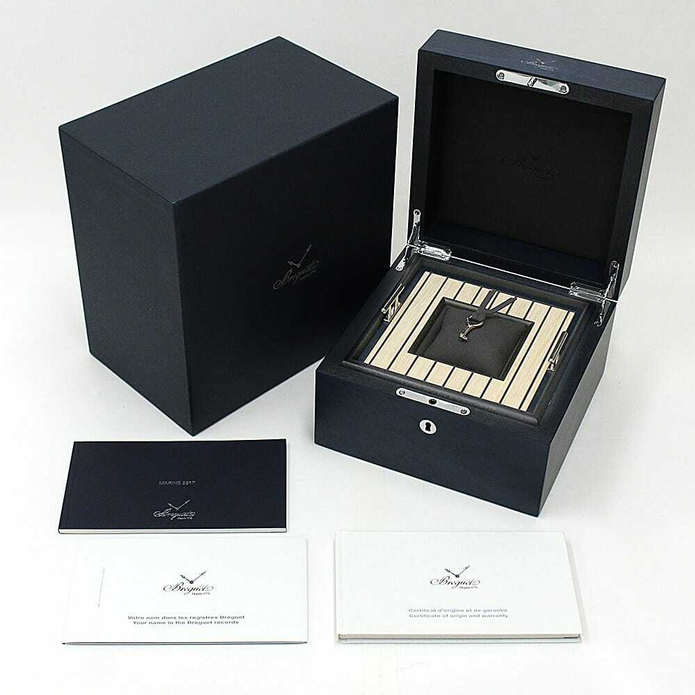 モデル情報 | 創業者であるアブラアン・ルイ・ブレゲが、フランス海軍のために製作したマリンクロノメーターにインスピレーションを得て誕生したのが、『マリーン』ウォッチです。このコレクションは、海と航海をテーマにしたデザインが特徴で、その背景にはブレゲの卓越した時計製造技術と海への深い敬意が表れています。特に、裏蓋にはシースルーバックが採用されており、その透明なガラスを通して、船の舵輪を模したローターが精巧にデザインされている様子を楽しむことができます。 |
