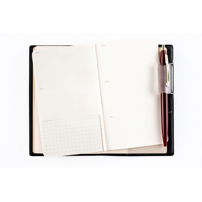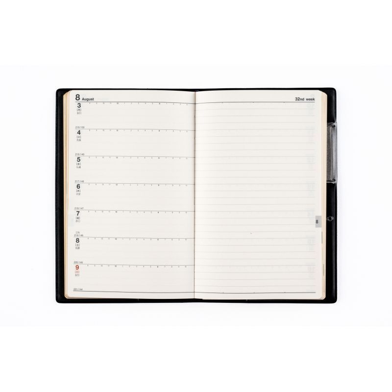 【週間予定表】左ページは1週間分のスケジュール欄、右ページはフリーの横ケイメモ。スケジュール欄にはタイム目盛りも付いていて、忙しいあなたの予定をしっかり管理します。