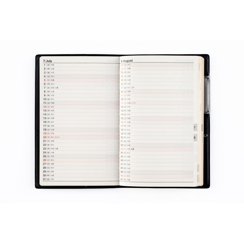 【月間予定表】週をまたぐ予定を管理しやすい横ケイ式カレンダー。巻頭に1年分まとまっています。記入欄が横に長いので記入がしやすく、一覧性に優れています。